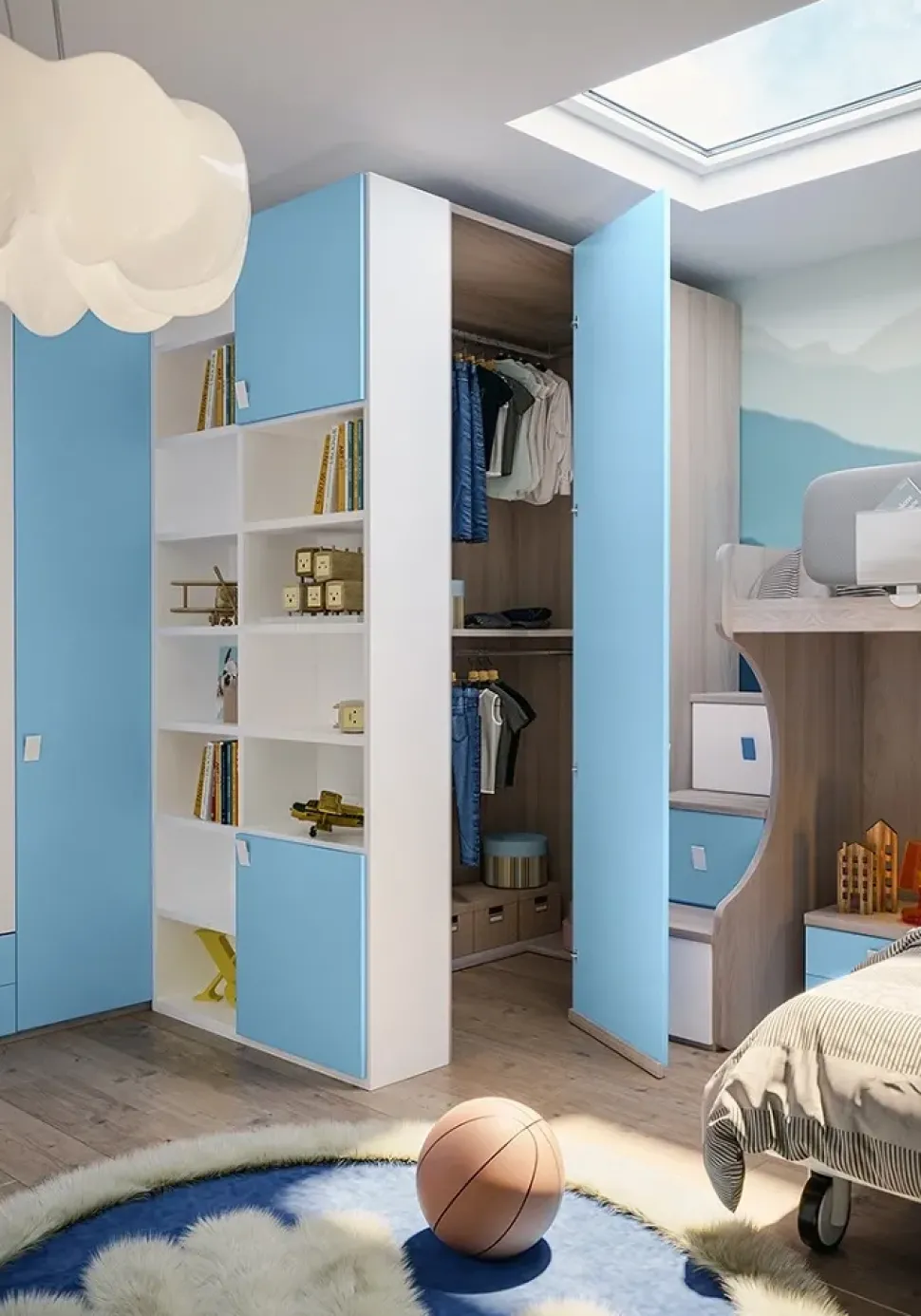 Cameretta con letto a castello con scaletta e cabina spogliatoio proposta nella versione con struttura Nobilitato Bianco e frontali laccati opaco colore Celeste.Viene composta da : 2/Colonne-armadio da cm.50 largh.x cm.58 prof. x cm.259,2h. 1/Colonna-armadio da cm.100 largh. x cm.58 prof. x cm.259,2h. 2/Colonne-libreria da cm.50 largh. x cm.33,6 prof. x cm.259,2 ciascuna. 1/Letto a castello da cm.200 largh. x cm.96 prof. x cm.141,5/175 altezza. 1/Protezione superiore da cm.142 x cm.42h. rivestita in Tessuto con tasche in Ecopelle.1/Letto-sommier ad 1 piazza e 1/2 da cm.130 largh. x cm.200 prof. completo di ruote. 1/Comodino a 2 cassetti da cm.50 x cm.42 prof. x cm.38,7h. 1/Scaletta laterale a 3 gradini da cm.50 largh. x cm.96,8 prof. x cm.108 altezza. Appartiene ad un programma componibile disponibile nelle misure e nei colori a richiesta. Viene prodotto dalla nota industria Giessegi considerata tra le aziende leader nella produzione di camerette per ragazzi. Viene prodotta con materiali di alta qualità con l’impiego di pannelli ecologici classe E1 e con l’utilizzo di vernici ecologiche a base d’acqua prive di solventi che possano nuocere alla salute. La composizione come foto ha come ingombri: cm.395 x cm.422 x cm.259,2 altezza. Viene proposta ad un prezzo decisamente interessante con lo sconto del 40%. Per qualsiasi informazione potete contattarci attraverso il nostro indirizzo di posta elettronica.Per tutti gli acquisti effettuati entro la fine del mese di Giugno,ulteriore sconto del 10%.