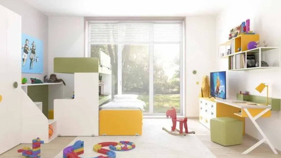 Per creare le atmosfere ideali per l’ambiente dei piccoli, scegli camerette dalle tonalità più intense e dalle forme morbide, cosicché l’ambiente possa trasmettere vitalità e positività; il brand ha optato per un materiale tanto pregiato quanto resistente per questa cameretta Mirta, ossia il laminato materico, tale da completare l’estetica della stanza ultimandone altresì le doti di praticità.