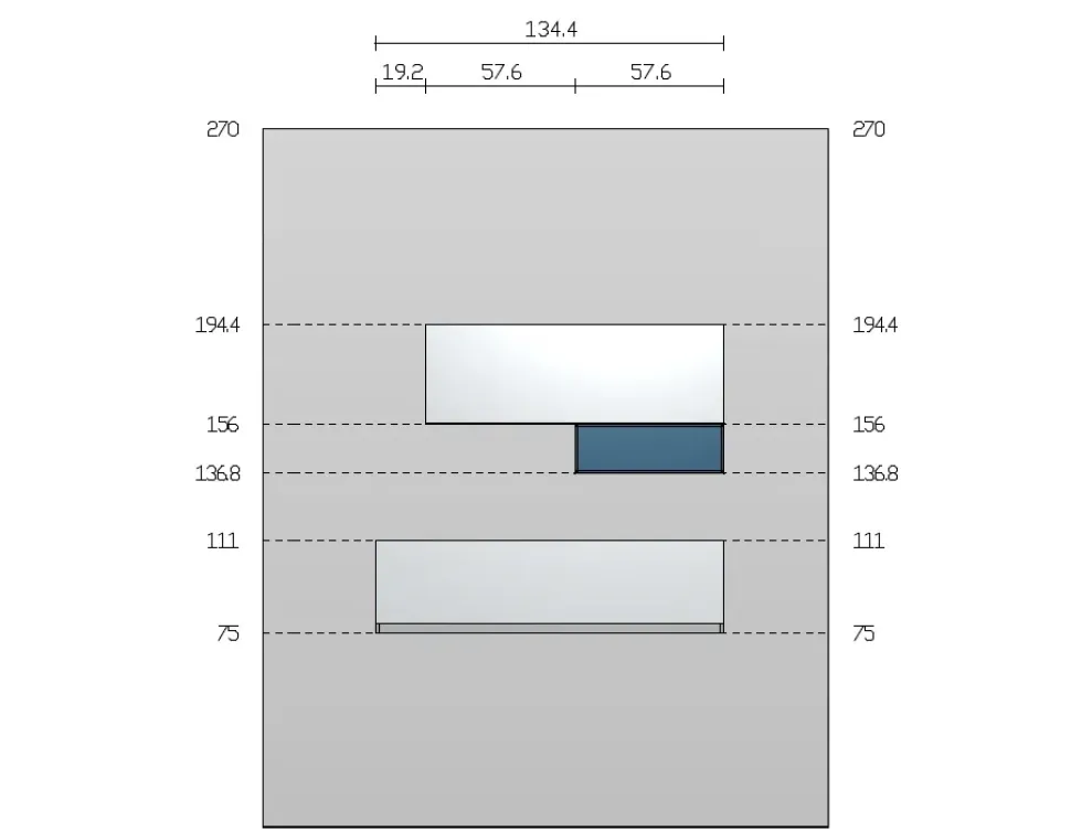 Scrivania sospesa con schienale, in nobilitato colore quarzo, pensile a ribalta in nobilitato colore quarzo e pensile a giorno laccato opaco colore blu pavone