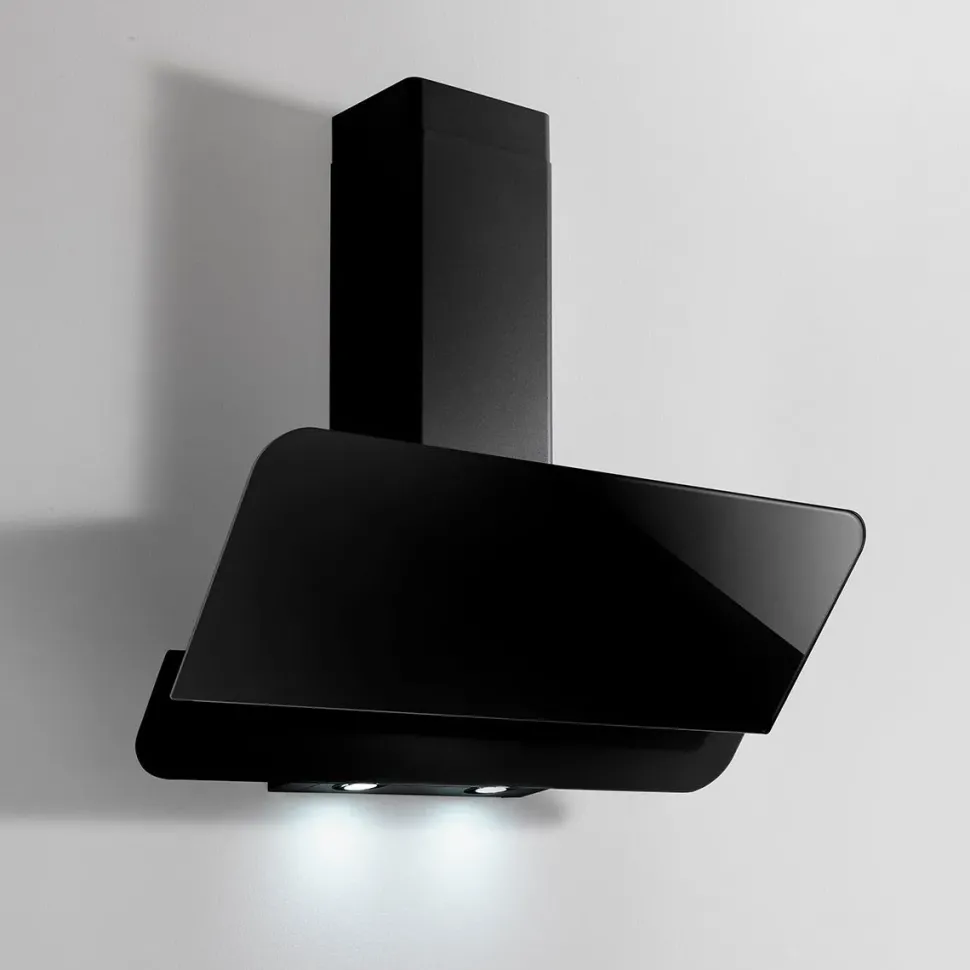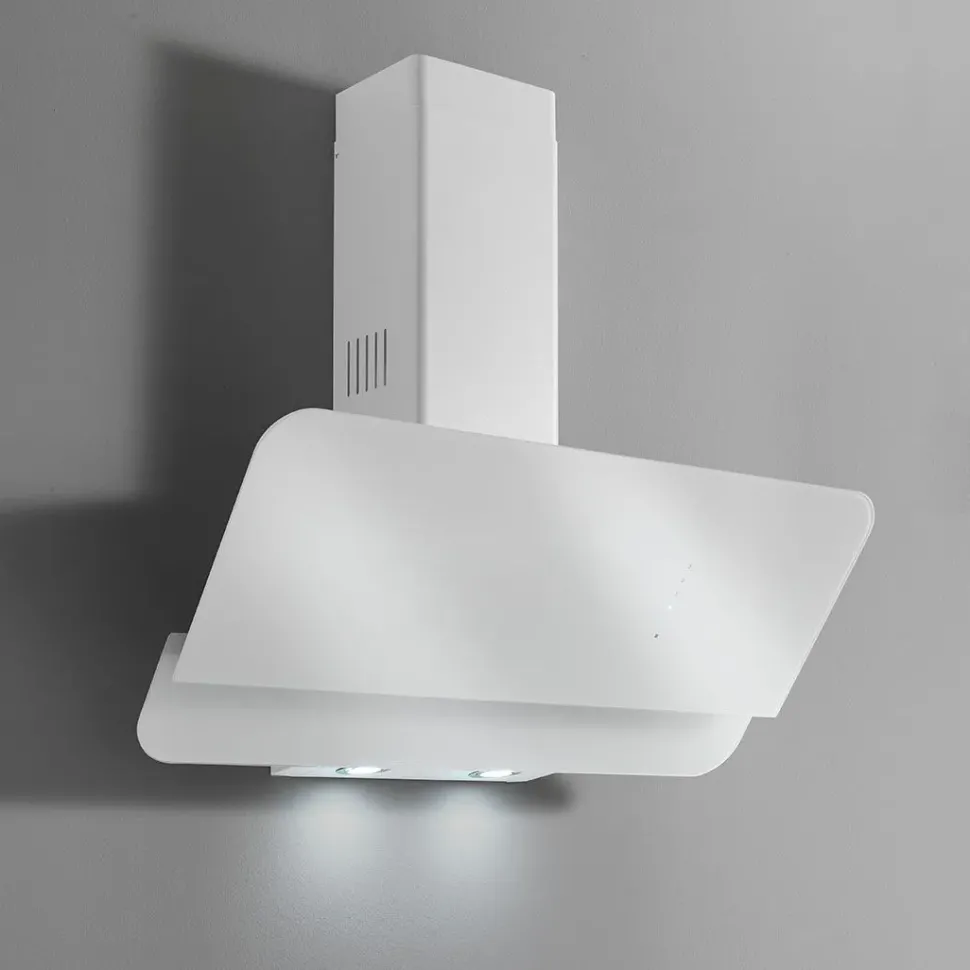 Griglia metallica antigrasso Uscita fumi ø 120 mm Colori Bianca con vetro bianco o nera Faretti led 2 x 2,1W – 4000K Aspirazione 500 m3/h Pulsantiera touch 5 velocità Misura CM L. 90
