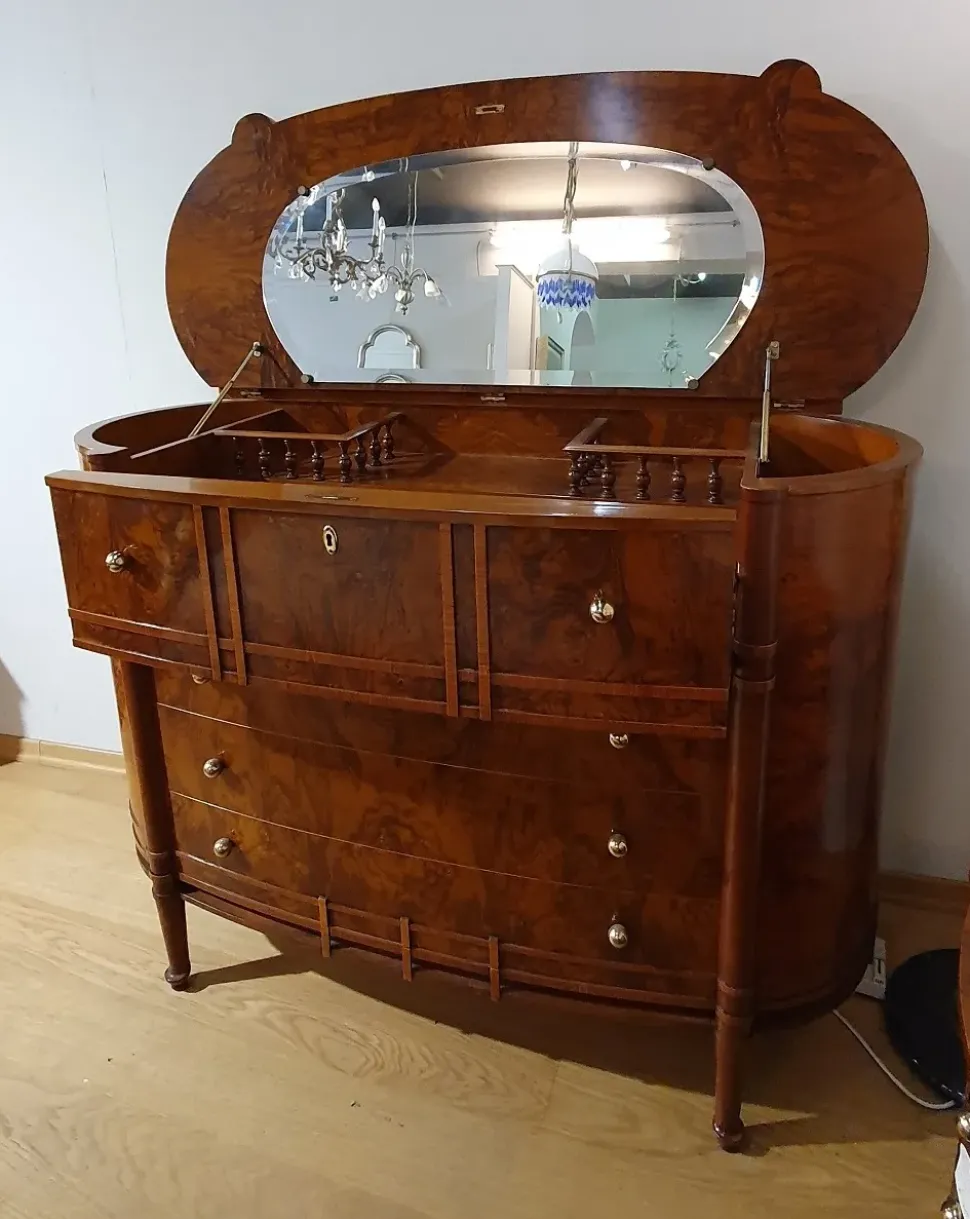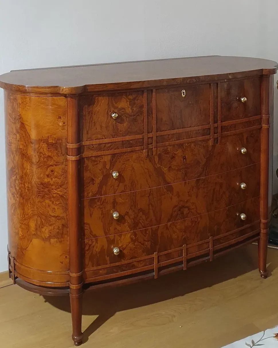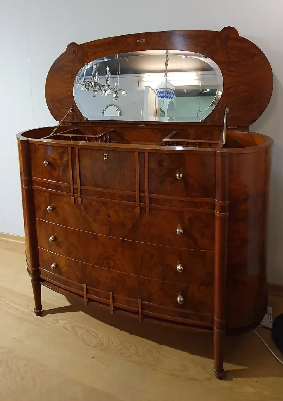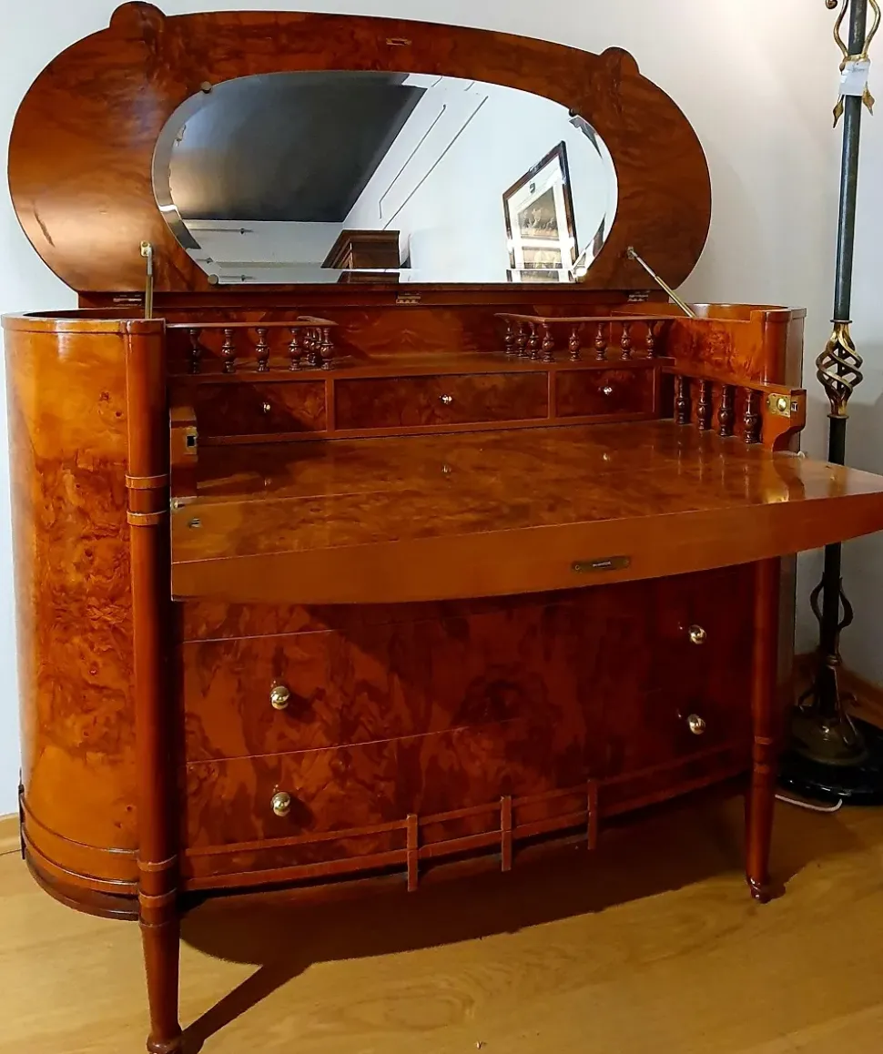 Gruppo comò comodini sicuramente particolare, caratterizzato da linea curva e una costruzione accurata. Le dimensioni del comò sono L. 132 x p. 60/80 aperto x h. 99 cm mentre i comodini L. 63 x p. 40 x h. 64 cm. Il cassettone in stile art-decò come i comodini, è realizzato in noce e radica di frassino e lucidato in un caldo tono con rifinitura a gomma lacca. Particolarità del cassettone è il piano che aprendosi rivela sia uno specchio che una zona toilette completa di cassetti scomparti ed anse, al di sotto si trovano tre cassetti di ampia misura, tutti i cassetti sono rifiniti al fondo con un tessuto moaire avorio. Il cassttone come i comodini sono anche percorsi da una belllisssima filettatura ad intarsio in bois de rose e tutti i cassetti hanno pomoli in ottone. Come per tutti i nostri mobili, l’imballo è omaggio ed il trasporto escluso, se richiesto, ci appoggiamo e lo preventiviamo solo con corrieri a noi abituali e specializzati in trasporto mobili.