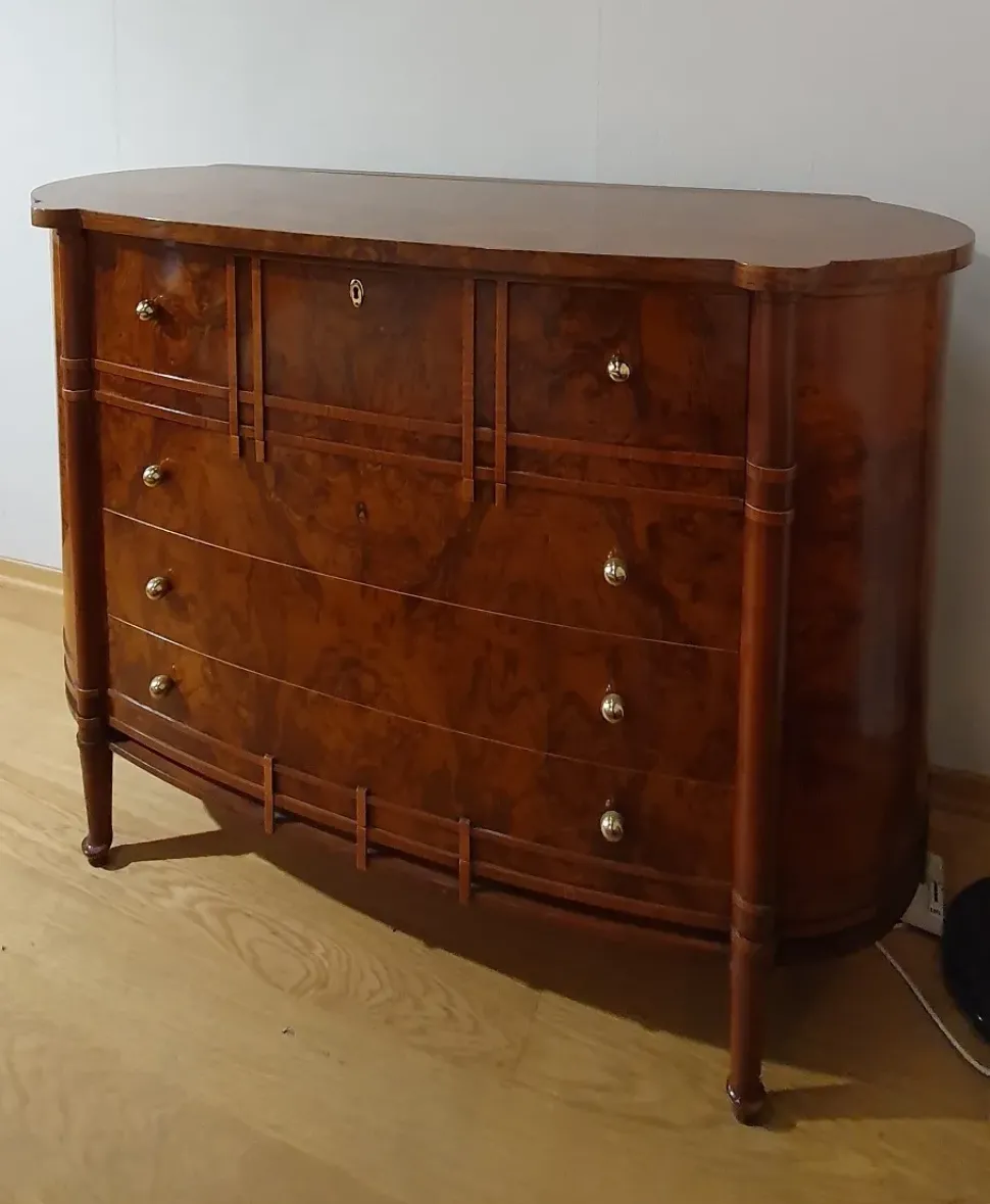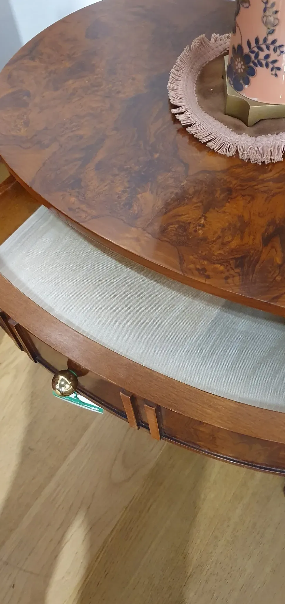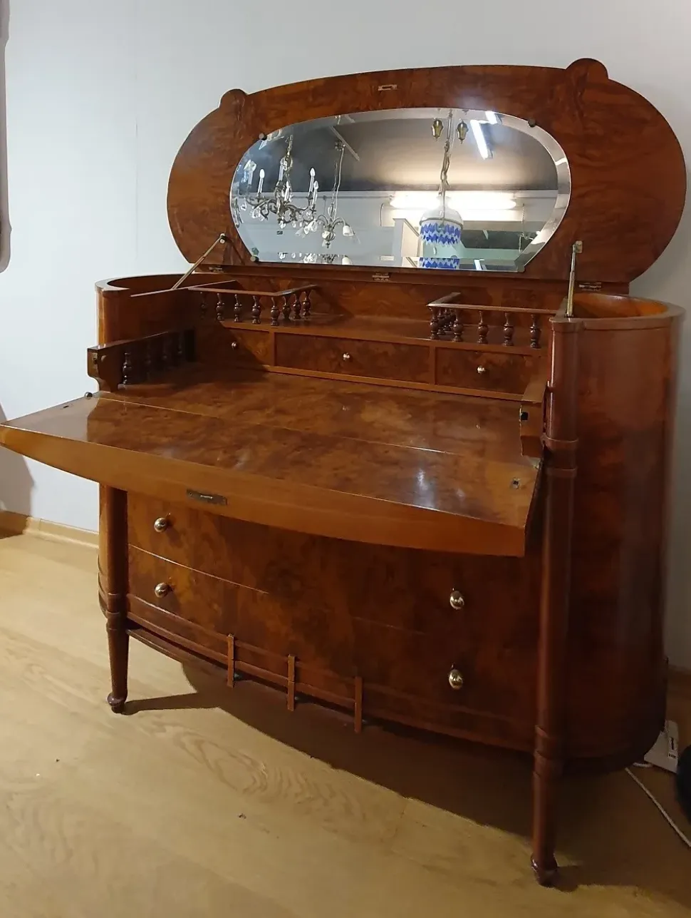 Gruppo comò comodini sicuramente particolare, caratterizzato da linea curva e una costruzione accurata. Le dimensioni del comò sono L. 132 x p. 60/80 aperto x h. 99 cm mentre i comodini L. 63 x p. 40 x h. 64 cm. Il cassettone in stile art-decò come i comodini, è realizzato in noce e radica di frassino e lucidato in un caldo tono con rifinitura a gomma lacca. Particolarità del cassettone è il piano che aprendosi rivela sia uno specchio che una zona toilette completa di cassetti scomparti ed anse, al di sotto si trovano tre cassetti di ampia misura, tutti i cassetti sono rifiniti al fondo con un tessuto moaire avorio. Il cassttone come i comodini sono anche percorsi da una belllisssima filettatura ad intarsio in bois de rose e tutti i cassetti hanno pomoli in ottone. Come per tutti i nostri mobili, l’imballo è omaggio ed il trasporto escluso, se richiesto, ci appoggiamo e lo preventiviamo solo con corrieri a noi abituali e specializzati in trasporto mobili.