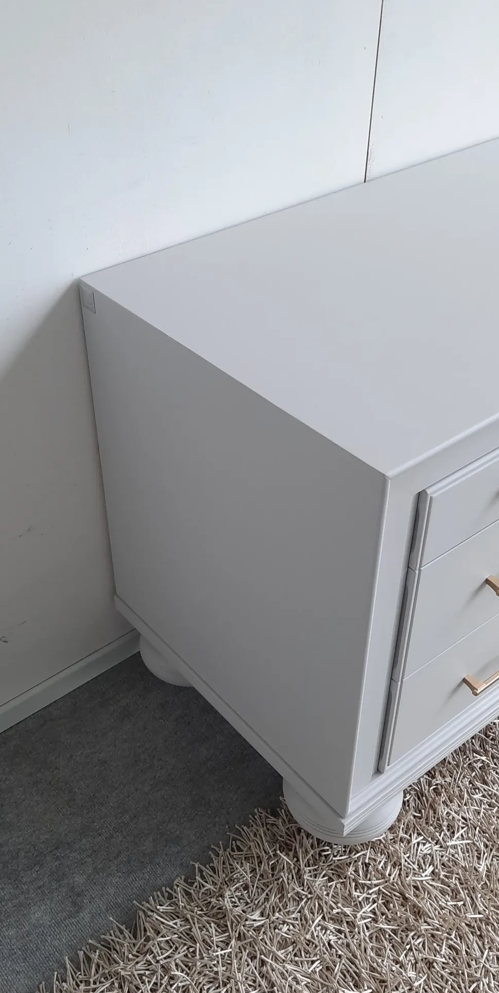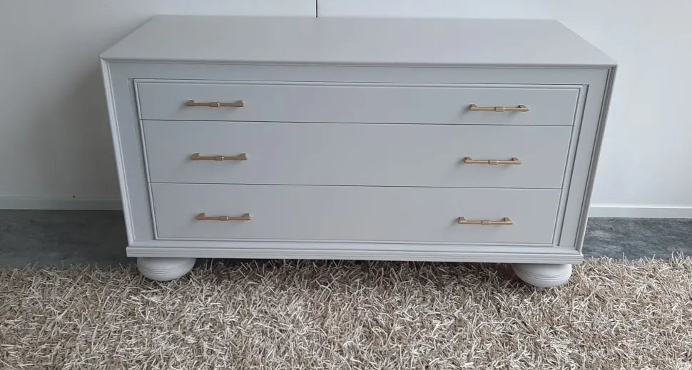 Comò a 3 cassetti completamente in legno , con finitura laccata color cenere opaco , impreziosito da maniglie color oro satinato , zoccolo a cipolla in legno massiccio Misure 134x56x74h POSSIBILITA’ DI AVERLO IN ALTRI COLORI (VEDI SCHEDA ALLEGATA) TRASPORTO IN TUTTA ITALIA INCLUSO NEL PREZZO (ISOLE CON SUPPLEMENTO)
