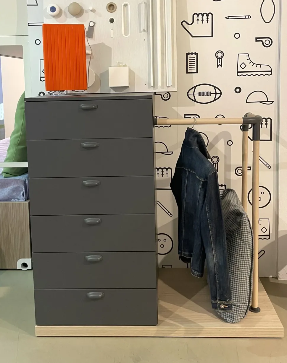 Battistella cassettiera Nidi. Il modello proposto in promozione è provvisto di comoda asta appendiabiti, le sue misure sono 120 cm d’altezza e 120 cm di lunghezza, mentre il colore è lavagna.