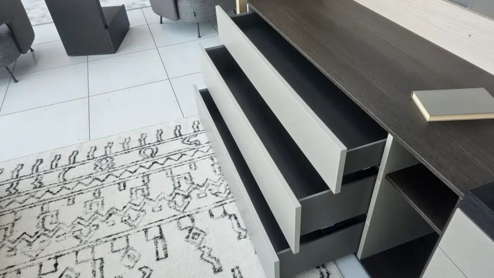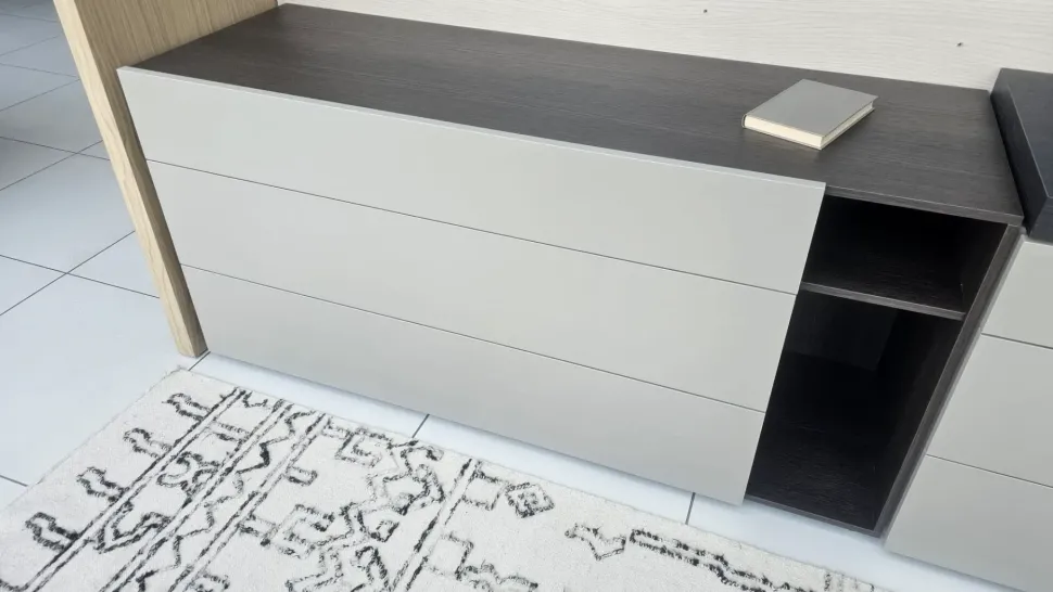 Comò cassettiera THEO con n.3 cassetti + vano Giorno sul lato destro, struttura finitura materico Rovere Moka e frontali finitura materico Arena, dimensioni disponibili cm. 152x51prof.x72h.
