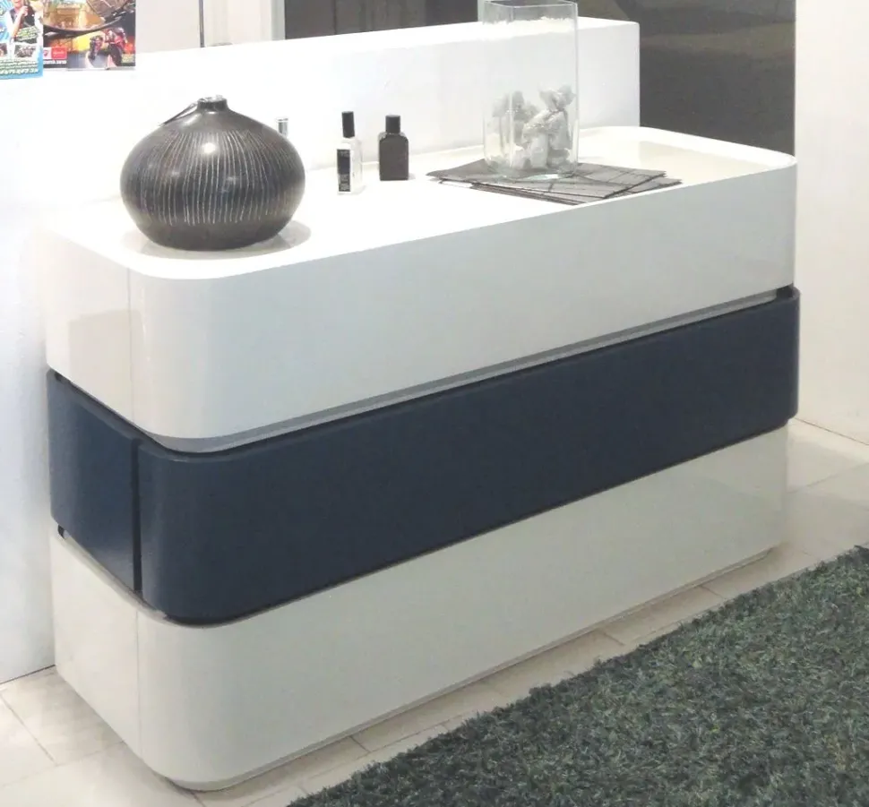 Il comò è composto da 3 moduli sovrapponibili in finitura laccato lucido bianco e l’elemento centrale in laccato opaco blu.