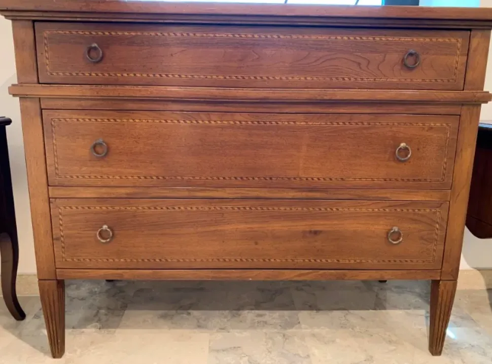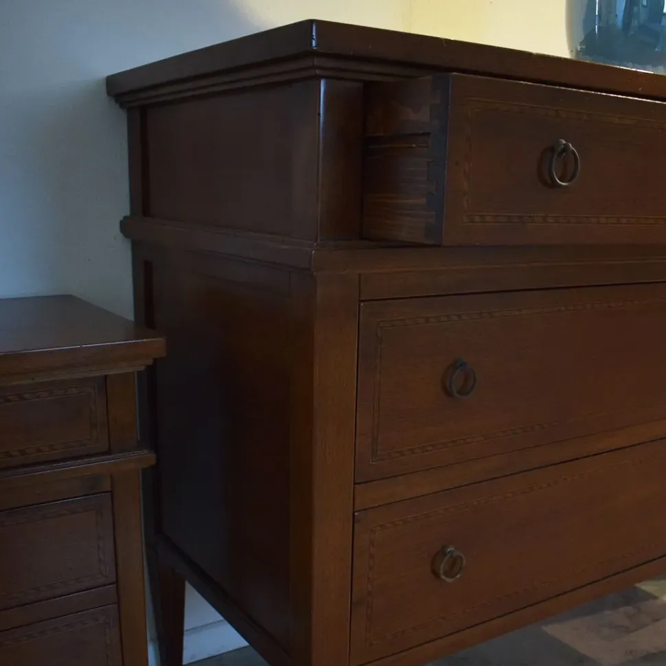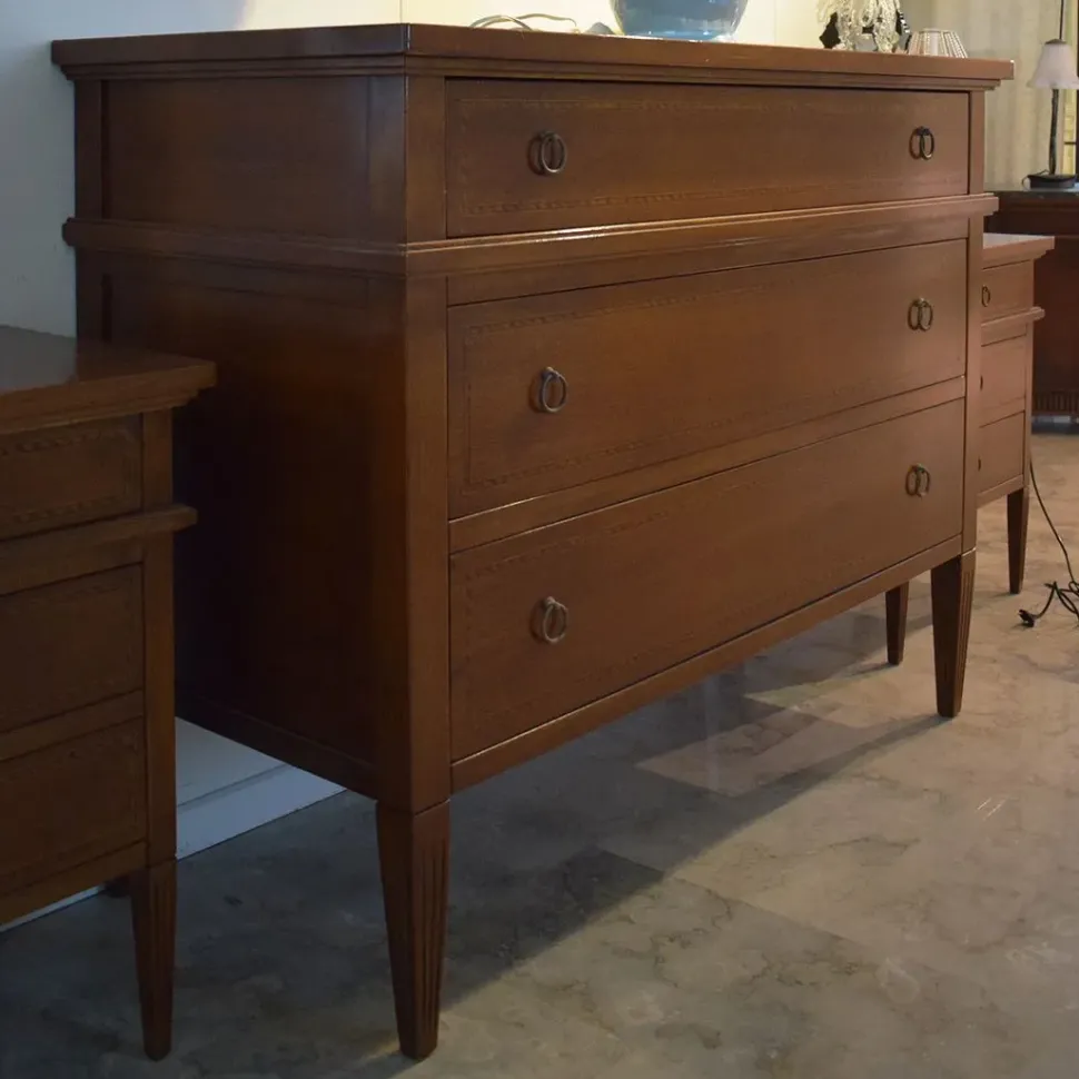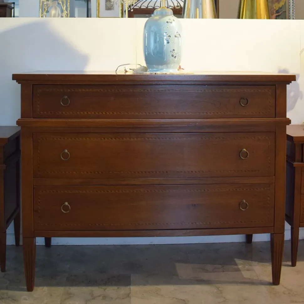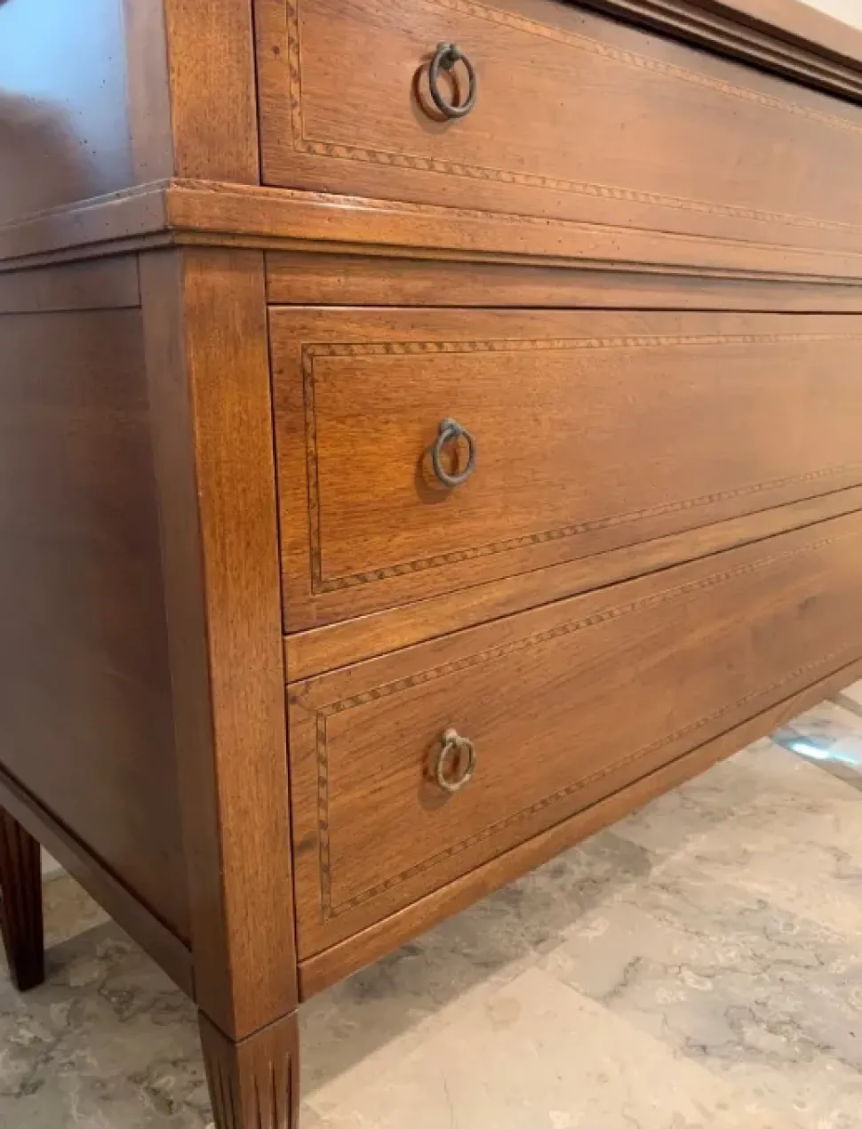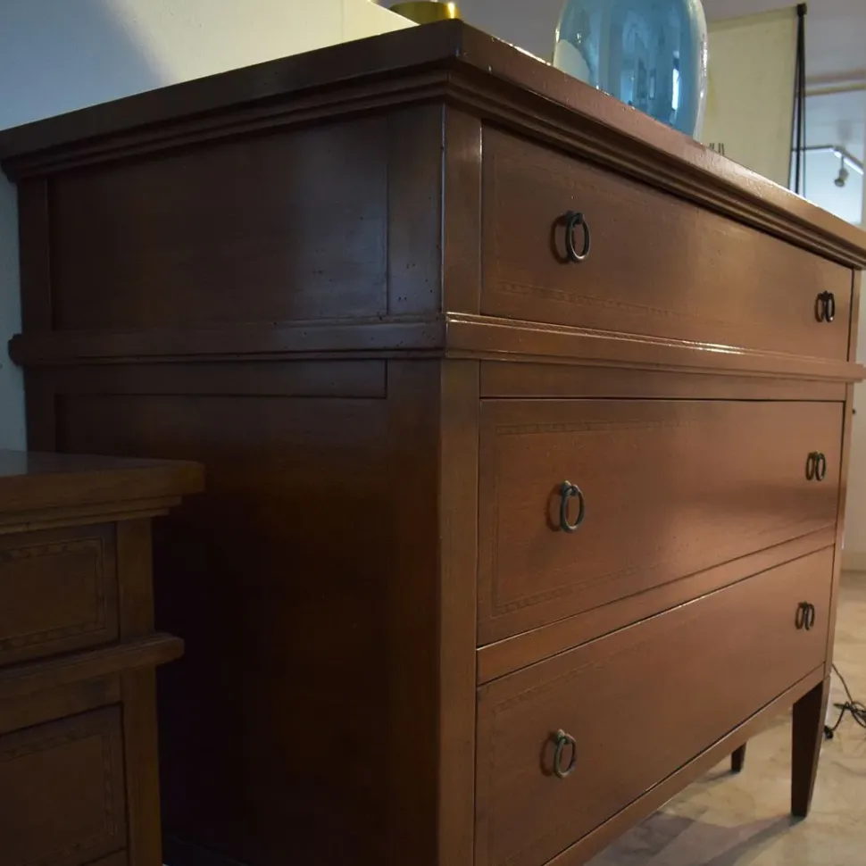 Il comò è strutturato con tre cassetti molto spaziosi con intarsi che formano una cornice in ogni frontale del cassetti, il tutto in legno di noce.
