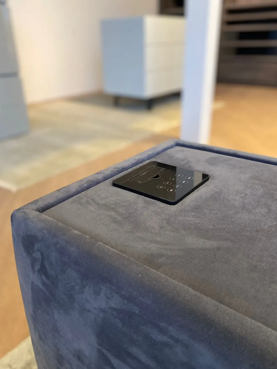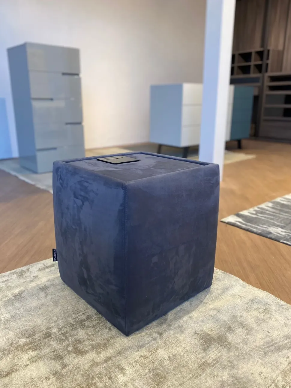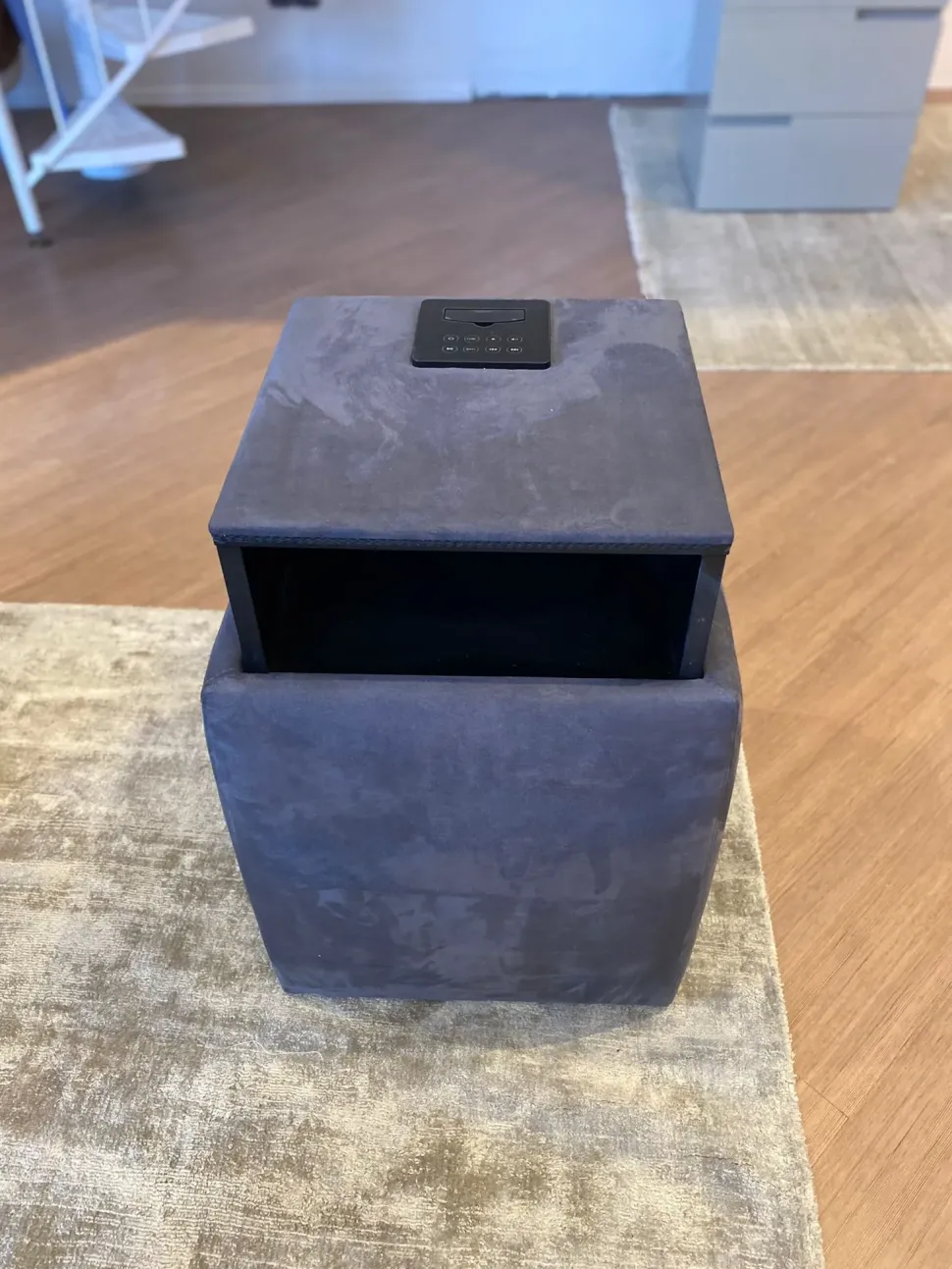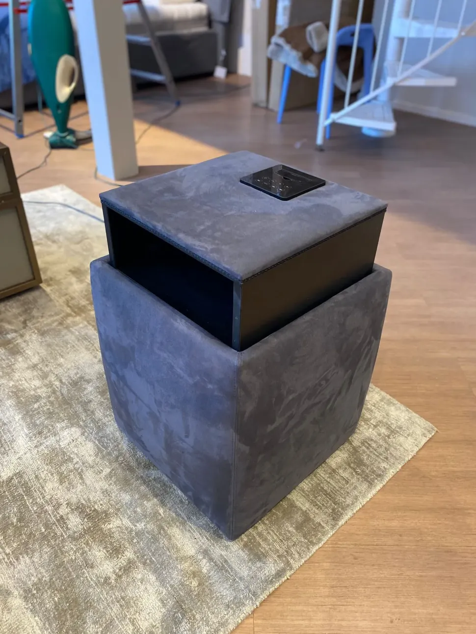 ARES di Bolzan è un pouf multifunzione, pratico e versatile. Qui presentato nella versione personalizzata con accessori opzionali come il cassetto push-pull e la dock station.