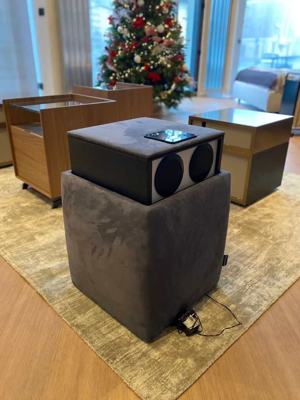Questo modello di design ha un cassetto a scomparsa, con apertura push-pull, che una volta sollevato mostra le casse circolari con subwoofer incorporato. Queste fanno parte del kit audio, con dock station.
