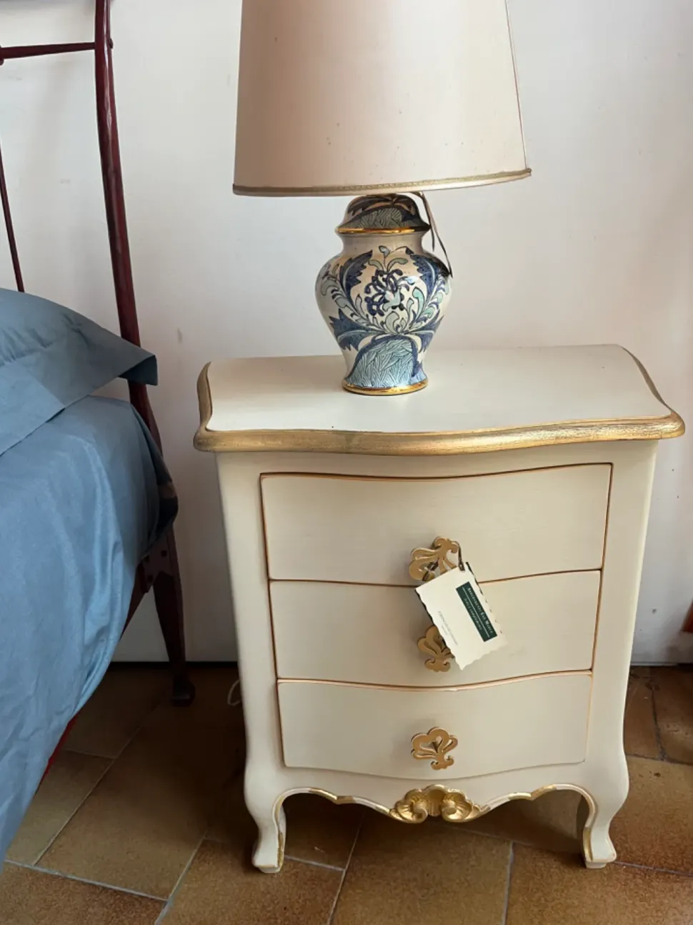 Due comodini il laccato bianco miele anticato , bordi foglia oro cm 57 x 35 x 60