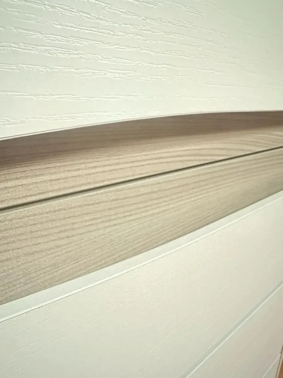Comodino di S75 della collezione infinity modello sirio. 2 cassetti con presa maniglia incassata nel pannello del frontale. Cm 52x47x h35. Struttura e cassetti bianco frassino, incasso maniglia olmo light.