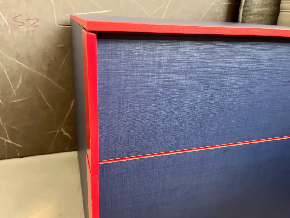 Il design essenziale, arricchito dal gioco cromatico tra blu e rosso, rende questo comodino un pezzo versatile: perfetto in abbinamento a letti e armadi moderni, ma anche come elemento di contrasto in ambienti più classici.