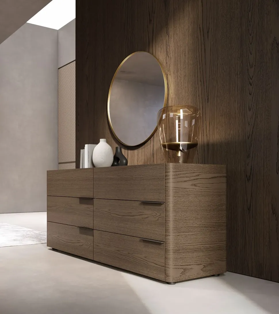 Comò e comodini realizzati in MDF impiallacciati rovere postformati e retrofiniti. Interno cassetti in finitura effetto pelle tortora.