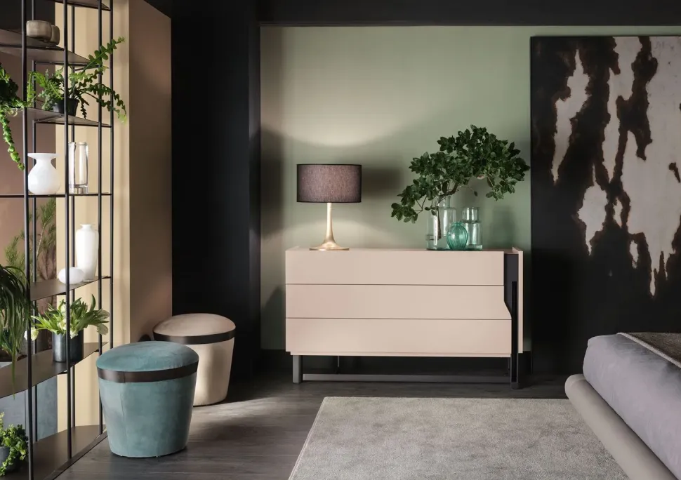 Comò Mirage, dal design rigoroso caratterizzato dalla base è ottenuta da un’unica barra di metallo scavato all’interno, crea sale diventando oltre che elemento decorativo, la base per la maniglia a incasso.