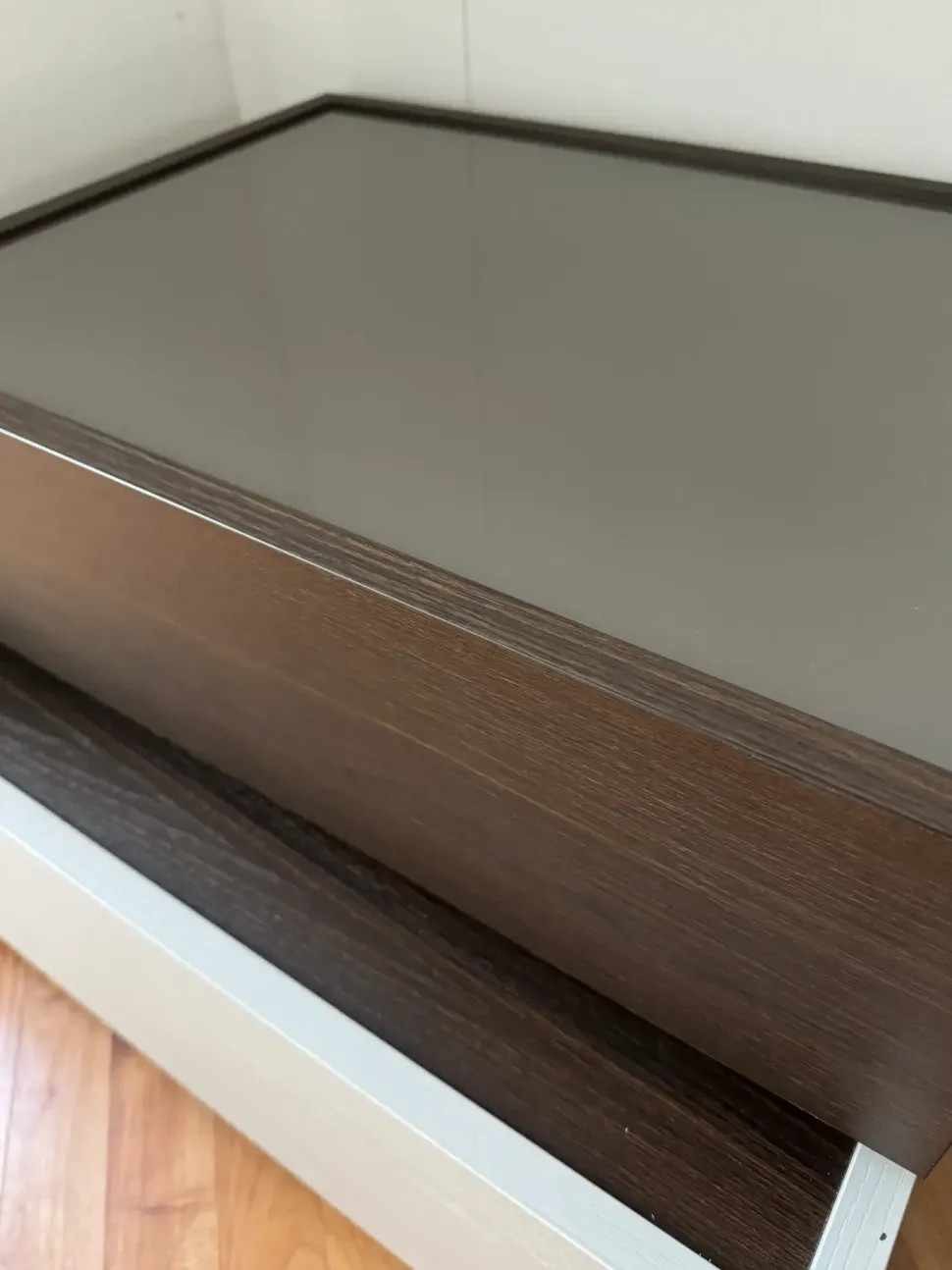 Comodino Replay composto da 1 cassetto L.72 P.51 H.26 in mt madreperla poro aperto + 1 Cassetto in appoggio l.60 H.18 P.44 in mt rovere termocotto con Vetro Lucido Smoke