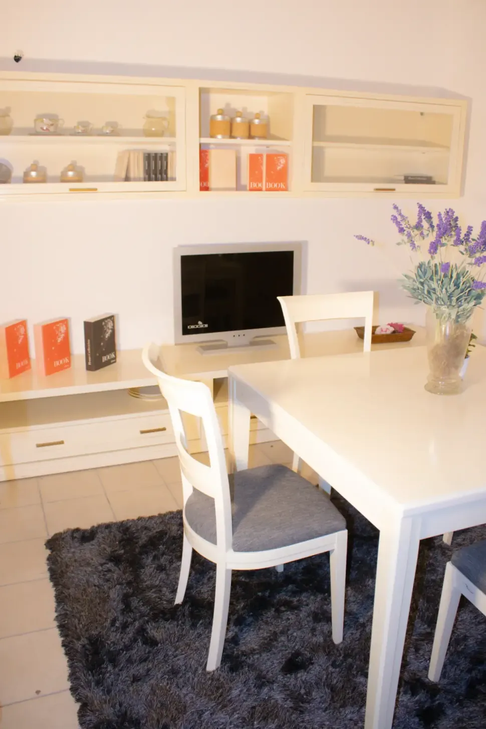 Mobile soggiorno con porta Tv e libreria sospesa in massello laccato bianco lucido,