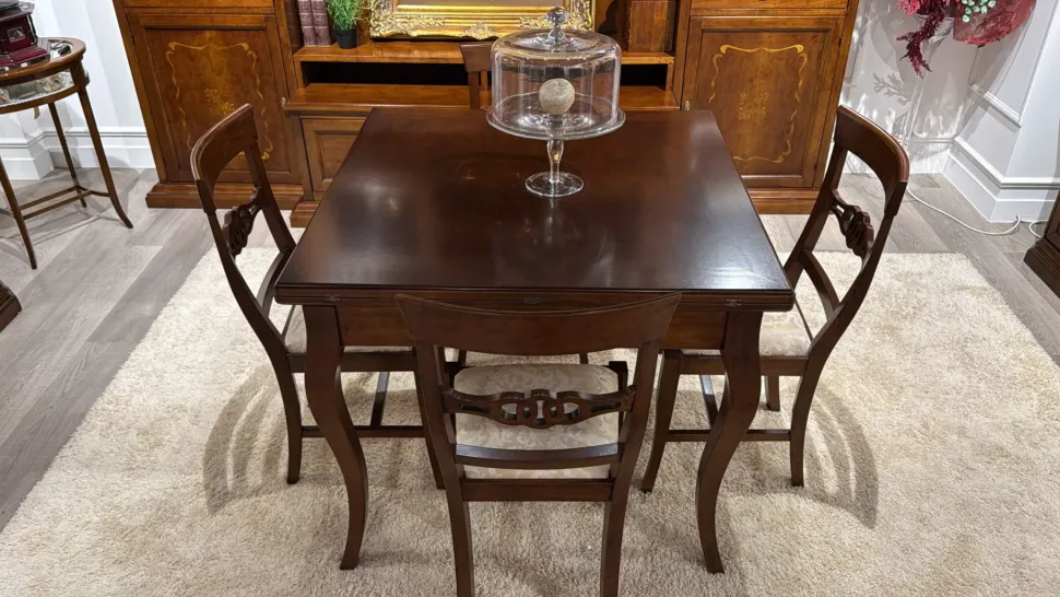 - tavolo quadrato con gambi a sciabola apribile a libro
