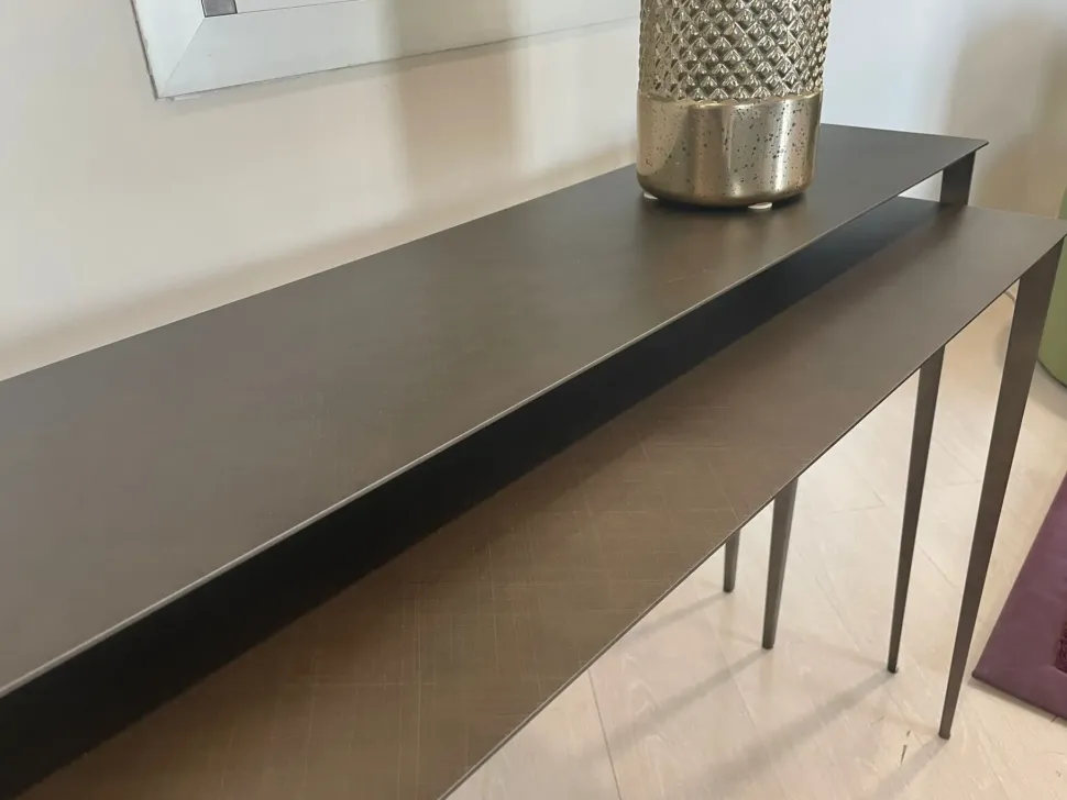 Consolle composta da due elementi, completamente in metallo laccato effetto metallo, finitura brushed bronze