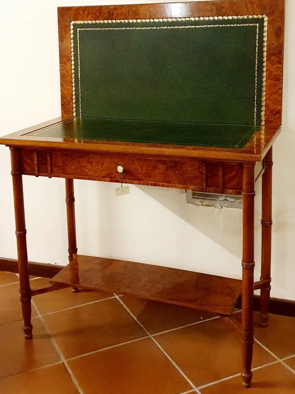 Consolle/tavolo da gioco realizzata con metodo artigianale in stile Art Decò, tutta in radica di frassino con preziosi intarsi sul piano a motivi floreali di dimensioni L. 90 x p. 45 x h. 80 cm. Non è solo una consolle ma con un semplice movimento si trasforma in tavolo da gioco da 90 x 90 cm con piano rivestito in pelle e cordonatura in oro. La consolle è completa anche di cassetto con pomello in ottone e madreperla. L’Eccellenza dei prodotti artigianali italiani è la qualità. Essa accompagna da sempre i suoi progettisti ed artigiani che vivono con passione ogni momento delle loro creazioni ponendo particolare cura al dettaglio, agli effetti più ricercati, al gioco delle proporzioni e a quello degli effetti cromatici. Una qualità che scaturisce dalla artigianalità, sinonimo di variazione, che garantisce l’assenza di ogni serialità proprio perché create a mano. Come per tutti i nostri mobili, l’imballo è omaggio ed il trasporto escluso, se richiesto, ci appoggiamo e lo preventiviamo solo con corrieri a noi abituali e specializzati in trasporto mobili.