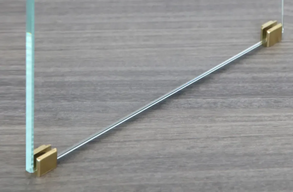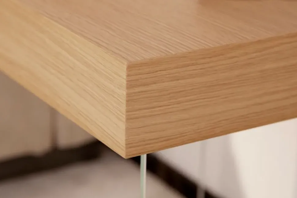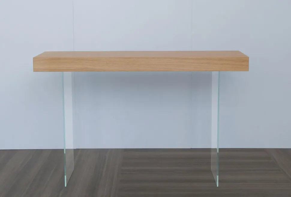 Consolle con piano orizzontale in tamburato di spessore mm 80, impiallacciato in Rovere Naturale, finitura opaca. Le linee verticali di spessore 10 mm, sono composte da cristalli extrachiari temperati. In omaggio, in dotazione 4 piedini regolabili in metallo, finitura ottone e 2 paraspigoli per bambini (vedere gallery fotografica).