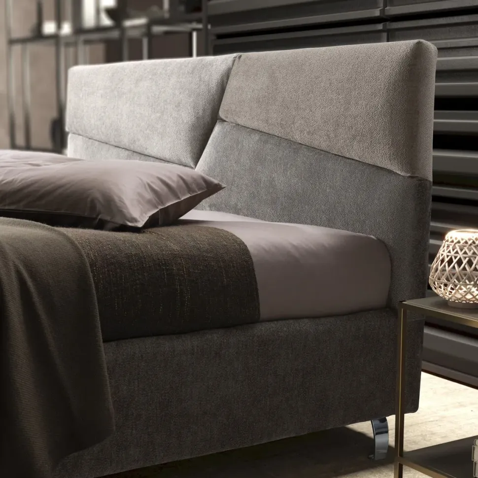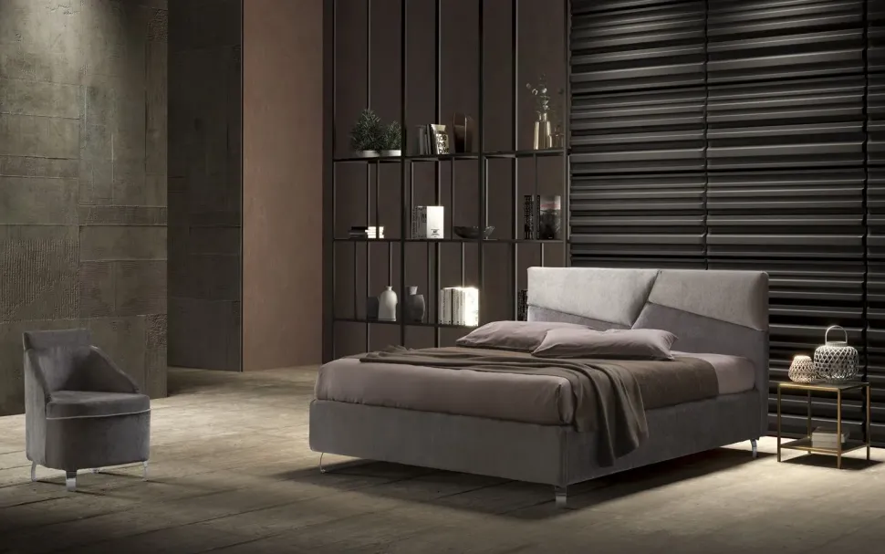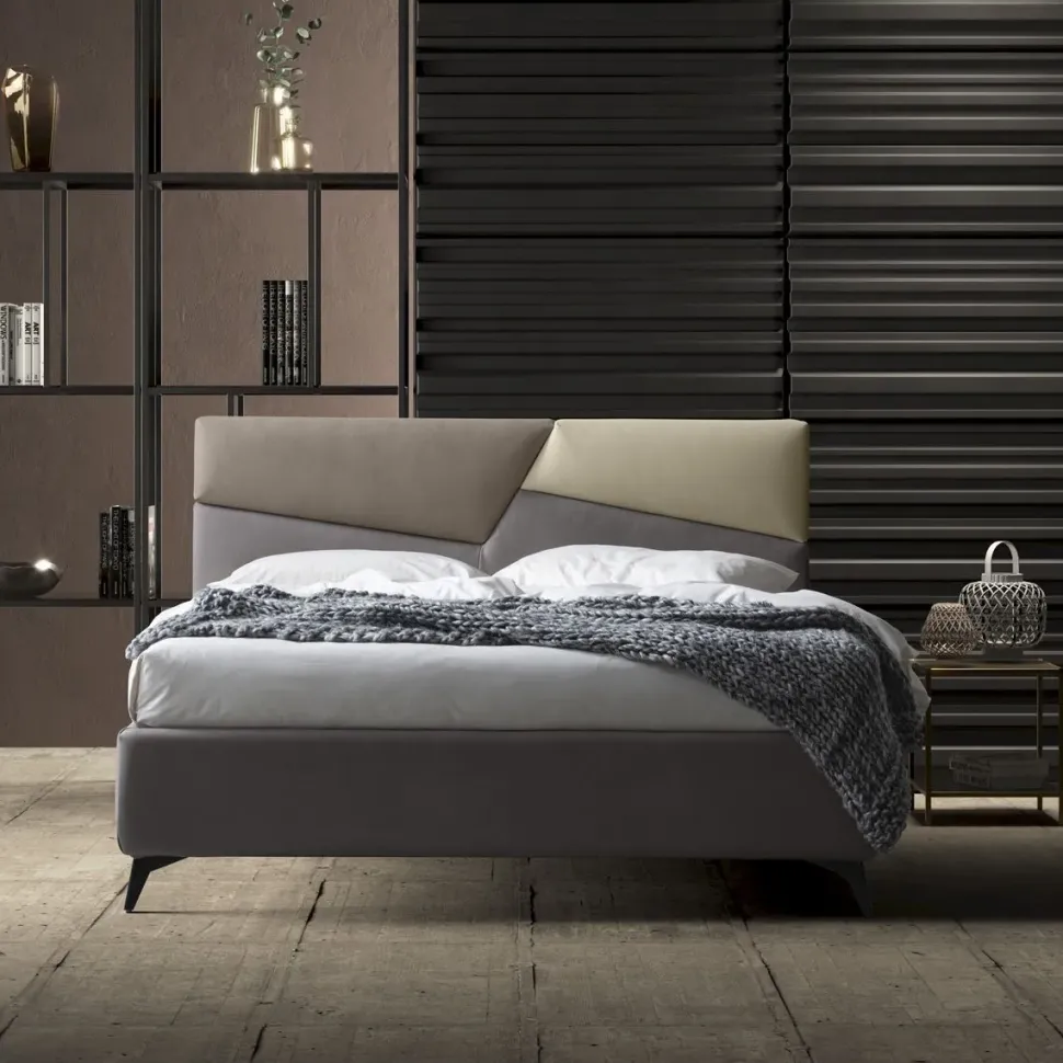 È un letto la cui testata è caratterizzata da tre pannelli morbidi imbottiti multicolore di forma geometrica che ne risaltano l estetica; i pannelli possono essere realizzati in vari colori utilizzando i diversi rivestimenti presenti nel campionario. Ogni elemento numerato (vedi immagini) può essere personalizzato con la gamma dei colori presenti nel campionario tessuti.
