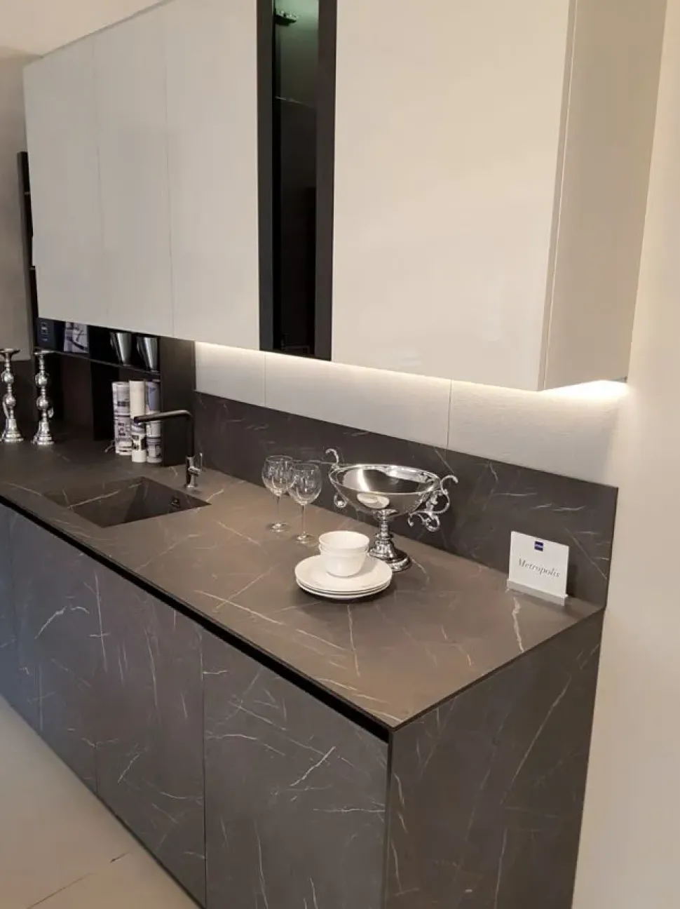 Cucina STOSA Mod. Metropolis ad angolo. Apertura tramite gola ,profili su ante, zoccoli neri ,ante in laminato grafite brown colore identico al top. Pensili in pet cachemire lucido. Top in Hpl grafite brown spessore mm 12, ELEMENTI caratterizzanti: – anta colonna frigo intera, – zoccoli h 8 cm, colore delle ante uguale al top, – elementi a giorno in legno in appoggi sul top, – top lato lavello profondo 75 cm, – pensile a vetro illuminato . DIMENSIONI : cm 350×305 H.210/242, Possibilità di modificare alcuni elementi per adattarli alla vostra cucina . Cucina Visionabile presso il nostro punto vendita, IN PRONTA CONSEGNA!