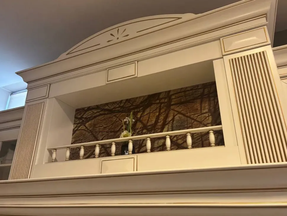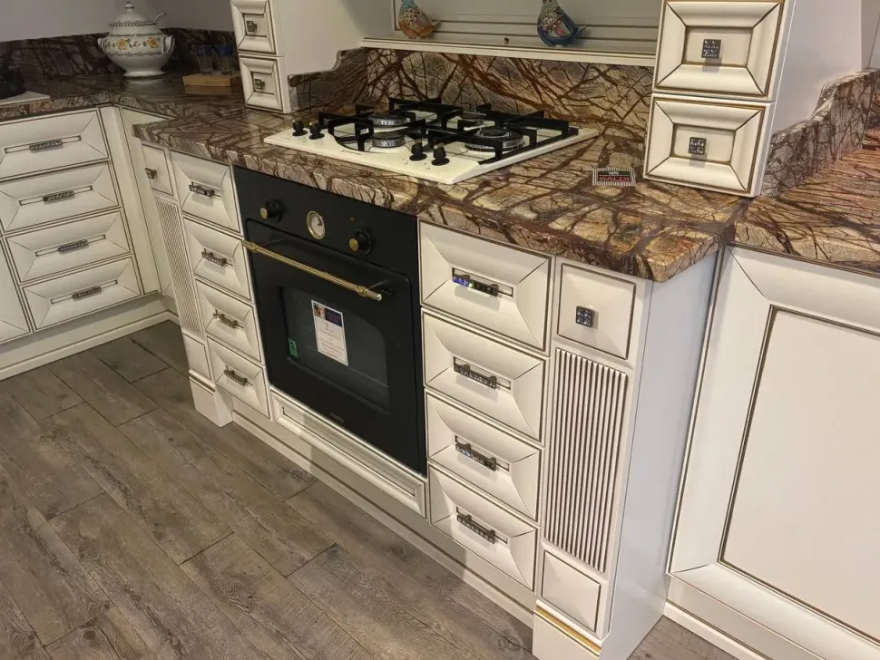Composizione angolare 409 x 329 x 220 cm, solo zona cappa H. 260 cm. Anta laccata bianca con filetto oro. Maniglie ottone con swarovski. Piano marmo Picasso brown spessore 3 cm. Portale cappa con cimasa. Attrezzata con cassetti e antine. Colonnine basi e pensili distanziale da 15 cm estraibili. Tavolo da 140 x 85 cm allungabile mod. Luigi XVI. 4 sedie mod. Luigi XVI.