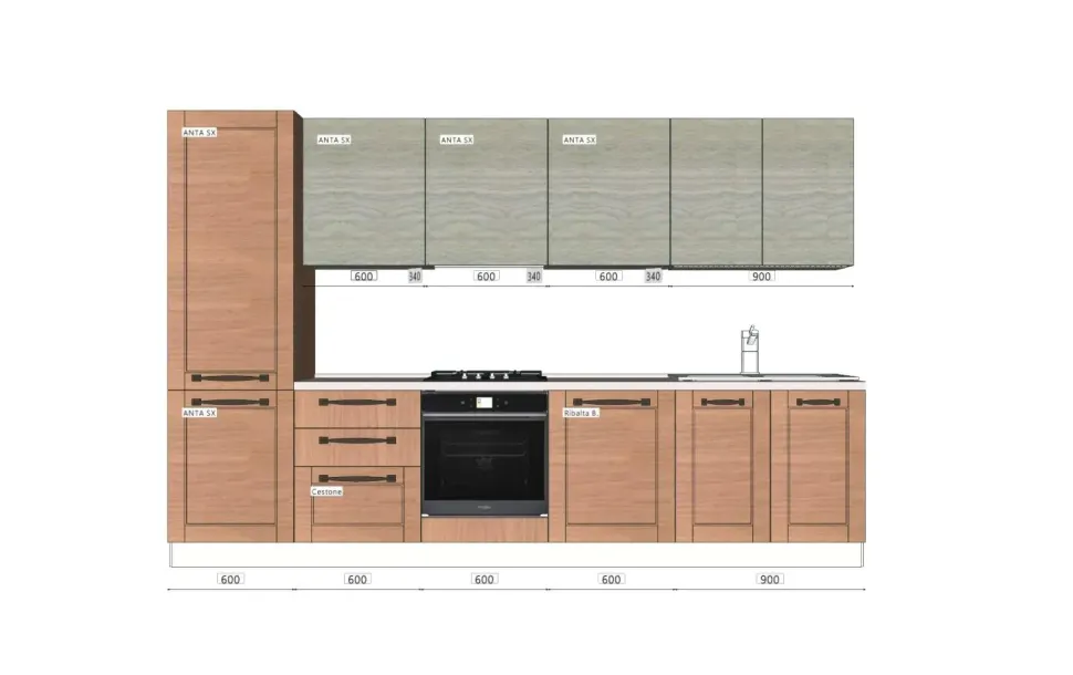 Il prezzo indicato è un esempio delle nostre proposte, Cucina Curry come da disegno di cm 330 con ante Telaio sotto e frassinate liscie sopra.