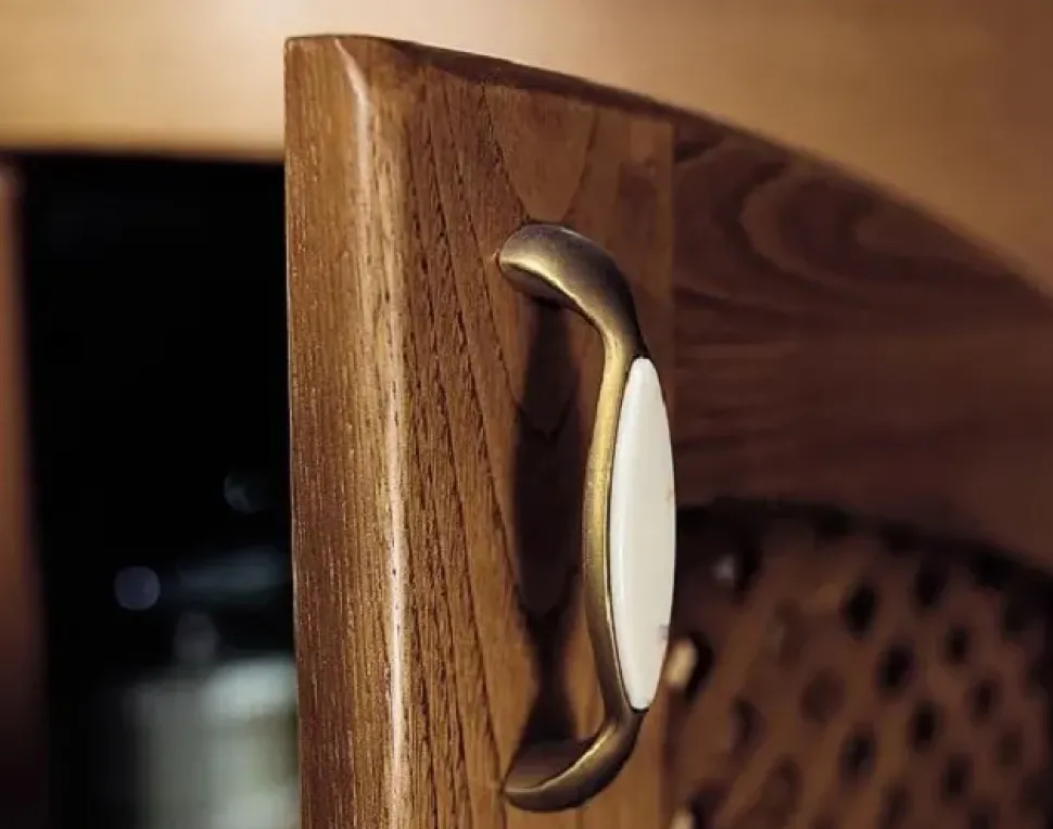 Le finiture artigianali, come il vetro decorato delle ante, le maniglie in ottone anticato e la scenografica cappa a vista da 90 cm, rendono ogni dettaglio un omaggio allo stile di una volta.