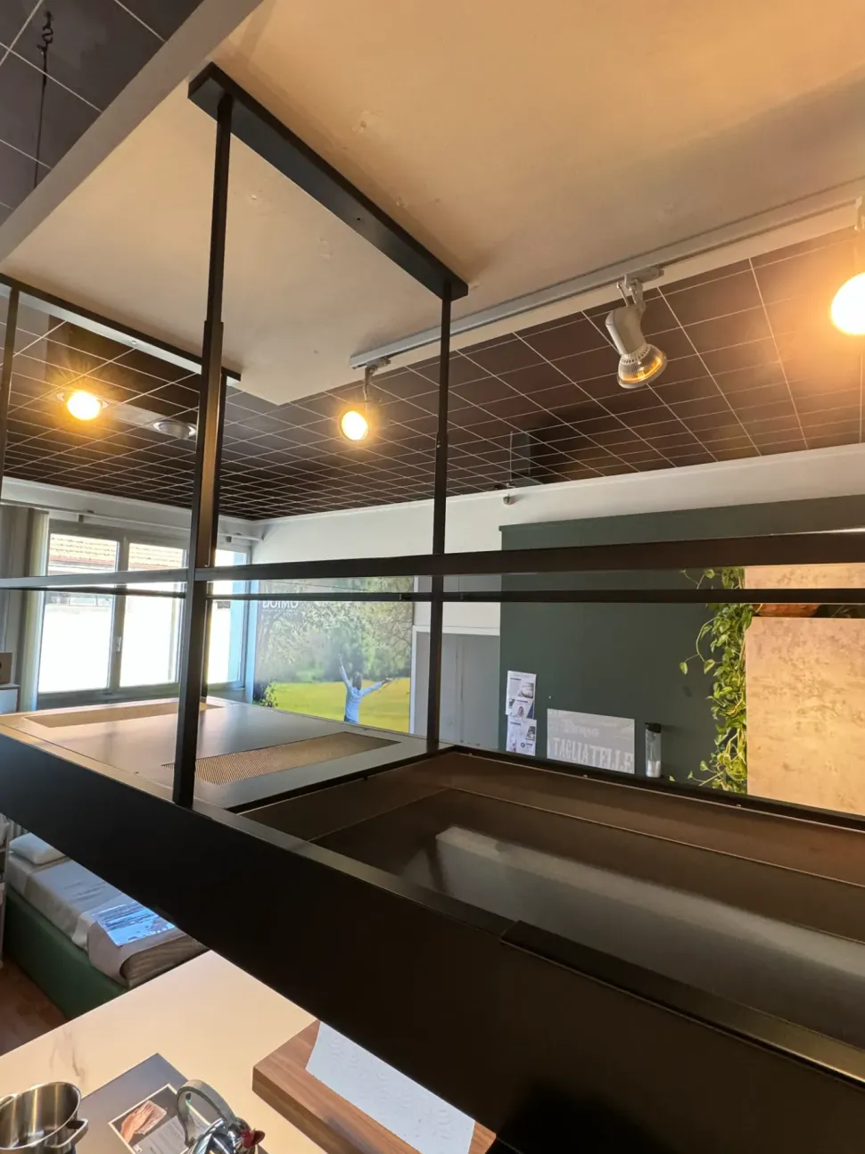 Sopra l isola troviamo la cappa con struttura verniciata nera, equipaggiata con mensole in vetro fumé, prese elettriche e area predisposta per vari accessori e funzionalità aggiuntive quali ad esempio un porta mestoli e porta rotolo.