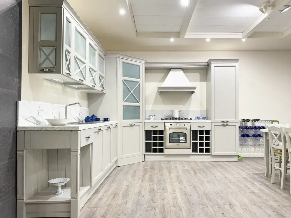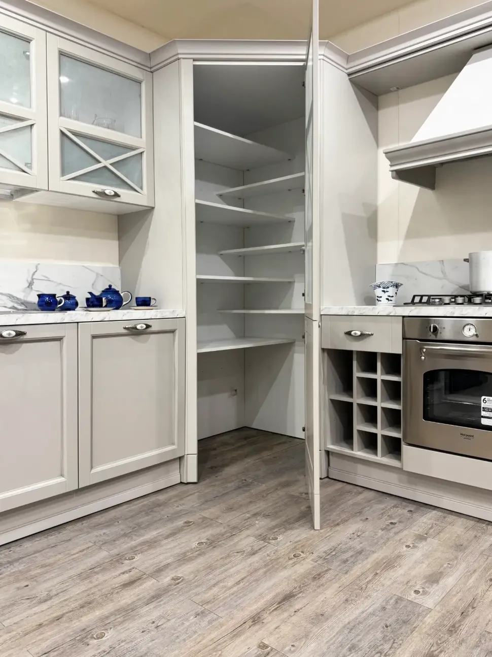 La cucina angolare Sinfonia di Colombini casa è un classico versatile che sa vestirsi a seconda della composizione: dallo shabby chic all industrial, dal coloniale allo stile toscano più tradizionale. I suoi richiami alla tradizione sono delicati e si prestano ad abbinamenti mai banali con elementi più moderni ed elettrodomestici green votati al risparmio energetico. Angolo dispensa capiente con vetro, Ante in grigio Dorian, maniglie Doria. La vetrina con inglesina e vetro serigrafato effetto tessuto crea volumi dal sapore romantico. La base con modulo portabottiglie pratica e funzionale, viene proposta in diverse configurazioni.