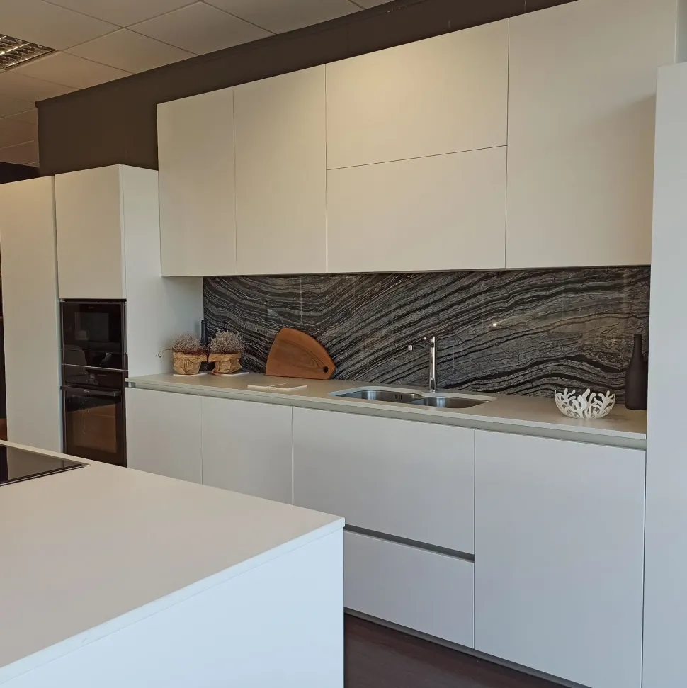 Composizione lineare con isola centrale. Cucina realizzata con materiali di qualità, ante di spessore 2,2 mm.