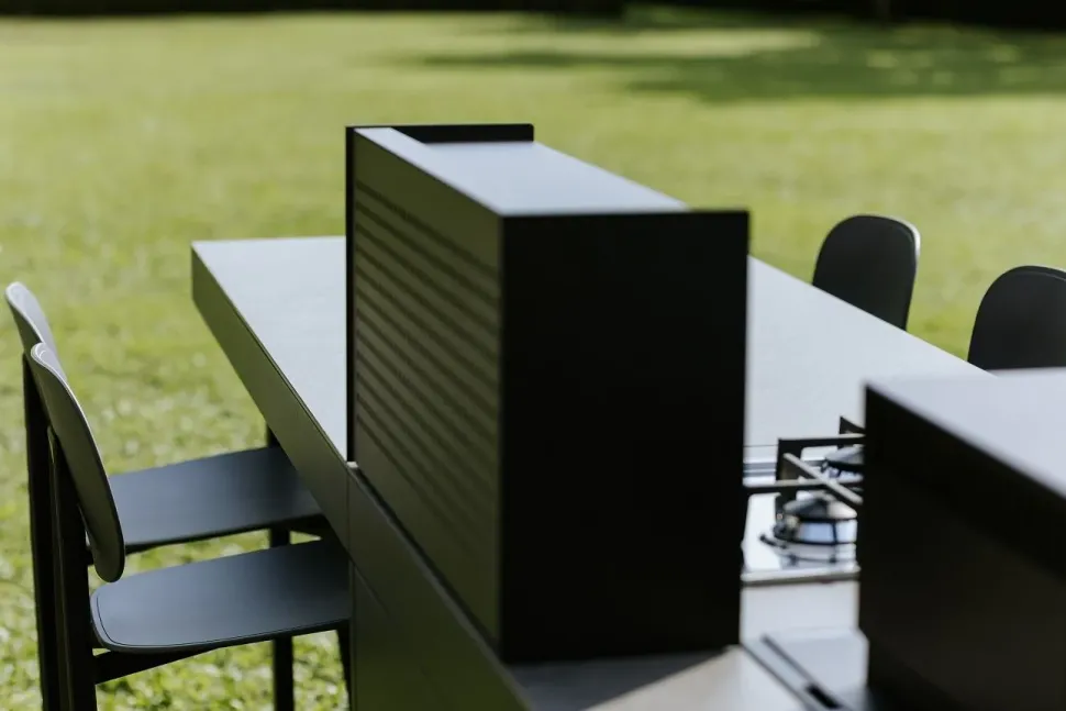 Le cucine outdoor della serie Agher si vestono di nuovi colori, ma il cuore dell’esperienza rimane immutato: creare nuovi spazi di convivialità. Ogni preparazione diventa un’opportunità per rallentare il ritmo e riscoprire il piacere della condivisione, esaltando ogni ingrediente. L’attenzione al dettaglio e la passione per la qualità si fondono, trasformando ogni pasto in un omaggio alla tradizione culinaria, arricchita da un tocco di modernità. Il nostro obiettivo è elevare il semplice atto di cucinare a un’esperienza di convivialità genuina, un trionfo dei sensi che celebra l’arte dello stare insieme. È un invito a godersi ogni momento con gusto apprezzando il design funzionale e la bellezza senza tempo di ogni cucina Agher. Nella nostra visione il colore non è un dettaglio, ma un’essenza che abbraccia e definisce lo spazio in cui si vive. La cucina Agher nasce con nuove palette di colori pensate per impreziosire ogni momento trascorso all’aperto. Ogni tonalità è stata accuratamente scelta non solo per la sua bellezza intrinseca, ma per la capacità di rispecchiare e amplificare il design e l’architettura di questi sofisticati spazi culinari. Il sistema brevettato Phobos® assicura eccezionale rigidità torsionale e isolamento termico. L’alta longevità della cucina è garantita grazie alla minimizzazione della dilatazione dei materiali e all’unione coesa, ma leggera, del piano in MDI alla struttura sottostante. La struttura è progettata con una perfetta composizione di materiali: acciaio inox, zinco magnesio e alluminio. Questa sinergia di elementi è stata meticolosamente calibrata per raggiungere un’eccezionale rigidità strutturale mantenendo al contempo un profilo di leggerezza. I piedini in acciaio inox con appoggio in gomma sono progettati per garantire la massima stabilità.