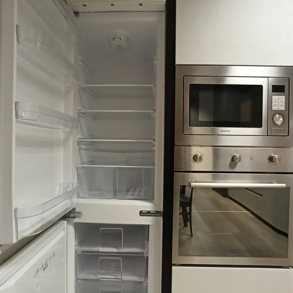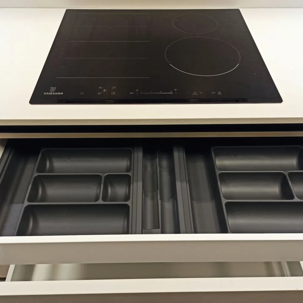 - Stile design: cucina Time con cappa a incasso, forno multifunzione, forno microonde ad incasso, frigorifero ad incasso, lavastoviglie a scomparsa, lavello fragranite, piano cottura induzione, top cucina HPL.