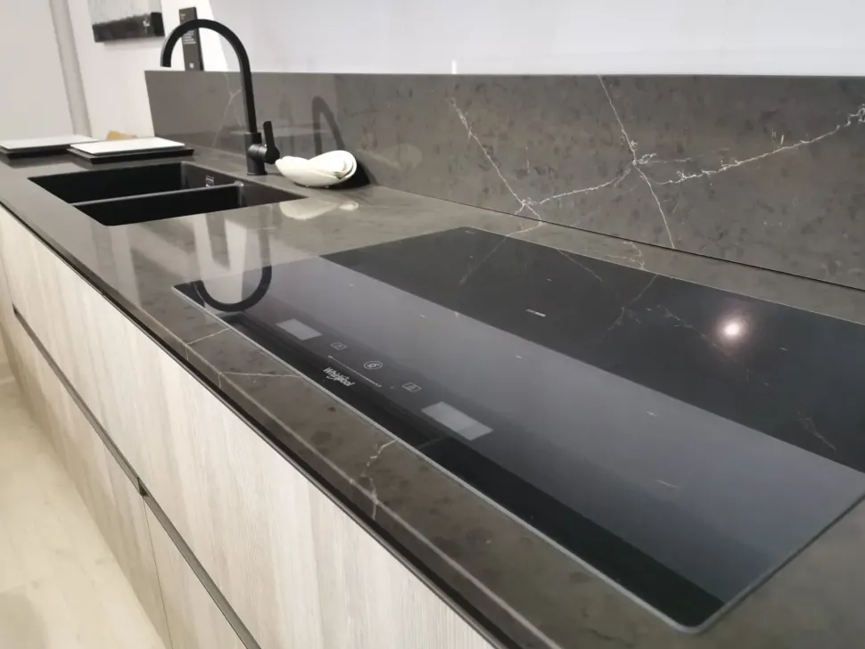 - In questa proposta non può mancare un top cucina che si rispetti: è incluso nel costo Outlet un banco operativo in quarzo, pensato per conciliare doti di praticità e design, mantenendosi nel tempo anche dal punto di vista dell’estetica.