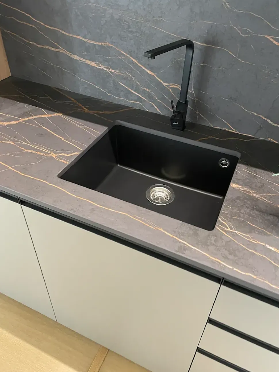 - Al fine di ultimare perfettamente una cucina, non mancherà un top cucina durevole all’usura e valido anche dal punto di vista dell’estetica: qui ne è incluso uno in Dekton, bello e in grado di resistere nel tempo.
