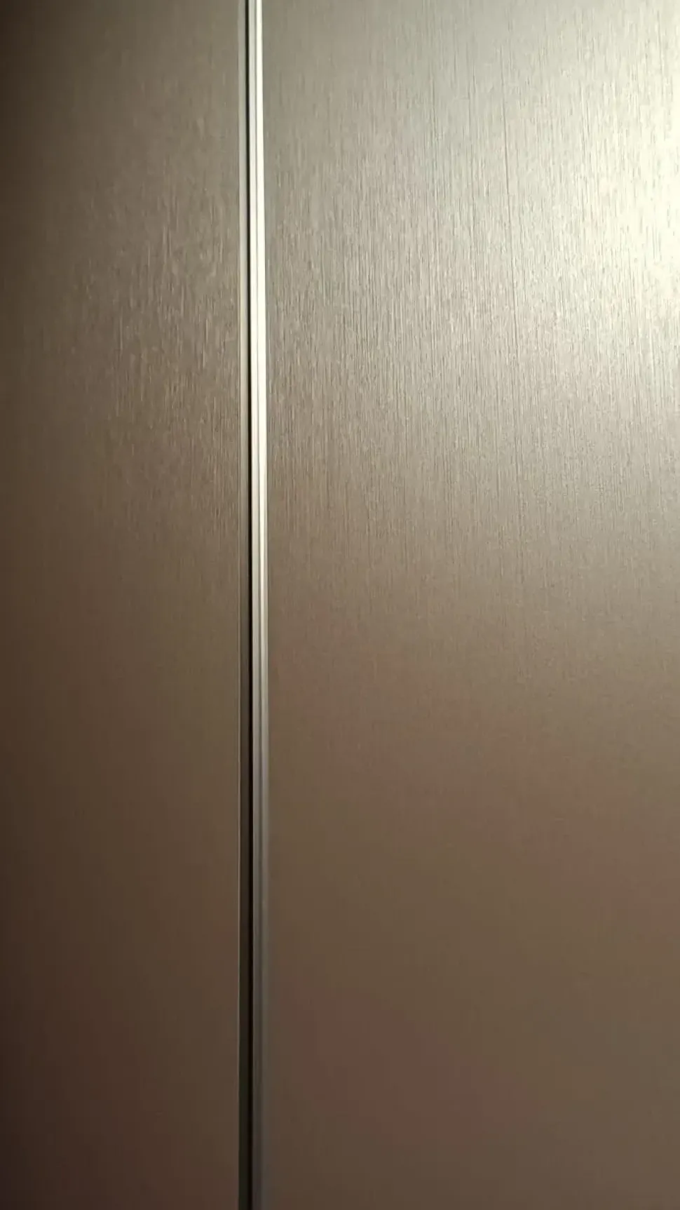 Composizione colonne, isola attrezzata e mensole a parete. Dotata di due frigoriferi integrati, Forno pirolitico e microonde, piano cottura a induzione con cappa integrata, lavastoviglie con comandi a scomparsa, presa su top a scomparsa totale e composizione mensole a parete con led integrato.