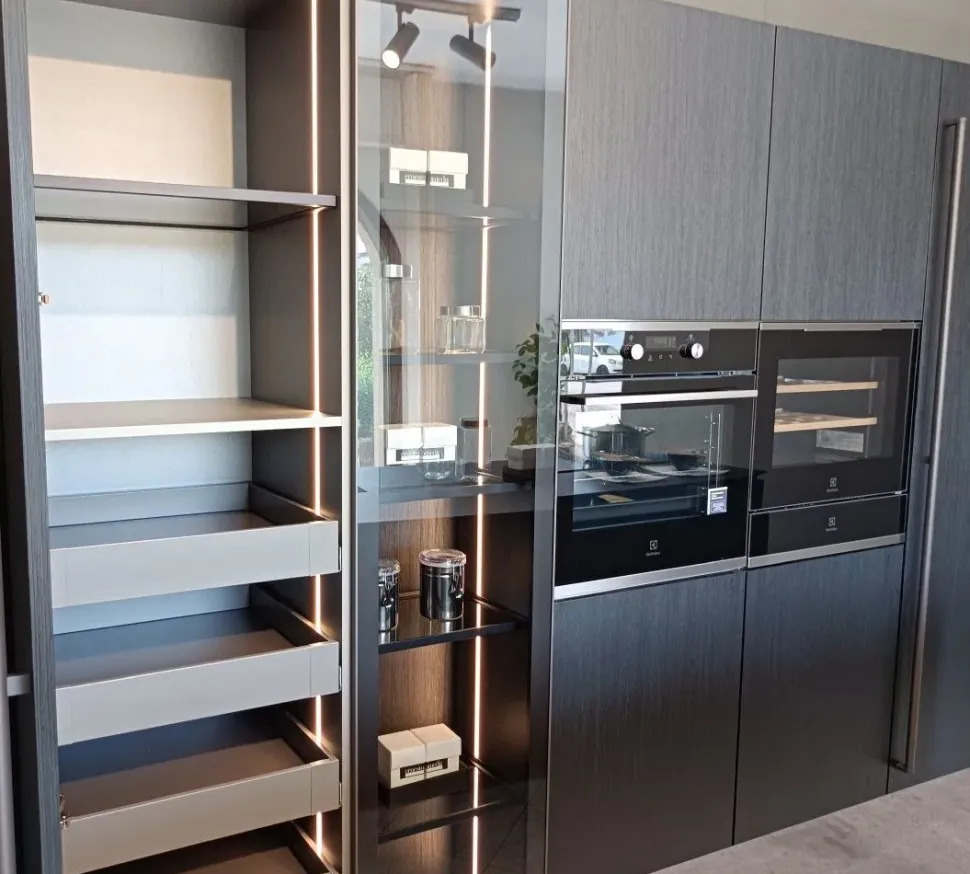 Il modello Obliqua – inspace costituisce la soluzione ideale per attrezzare lo spazio in una cucina di molteplici dimensioni, difatti quella qui in Offerta Outlet è con isola.