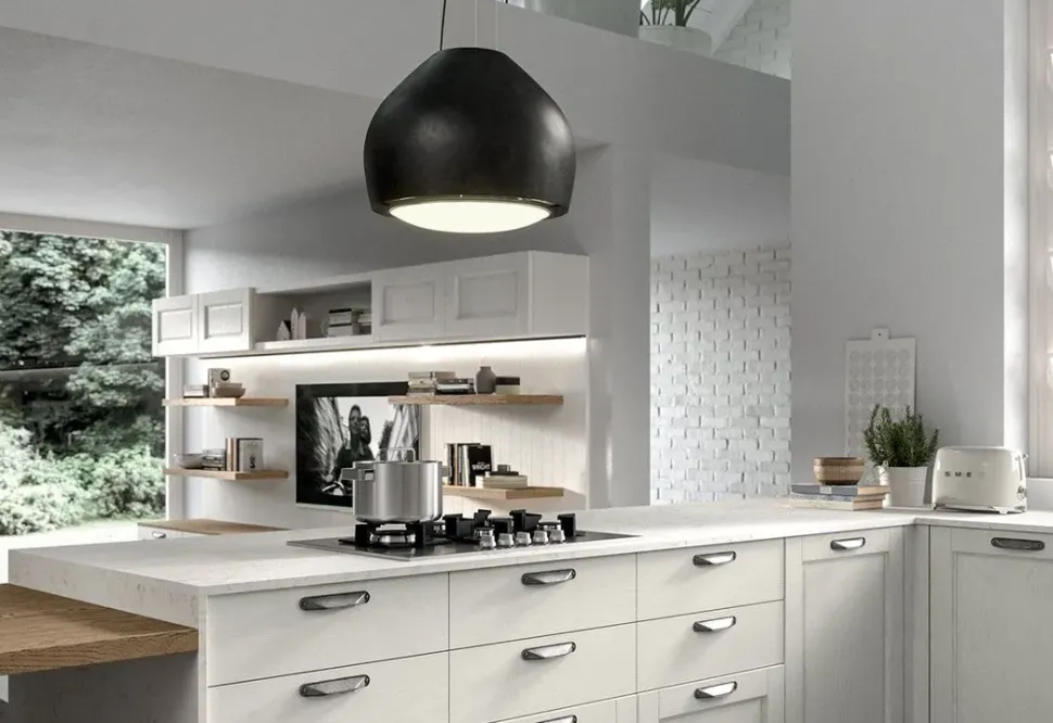 La cucina con penisola Virginia soddisferà ogni tua esigenza, adattandosi perfettamente a locali di diverse forme e misure.