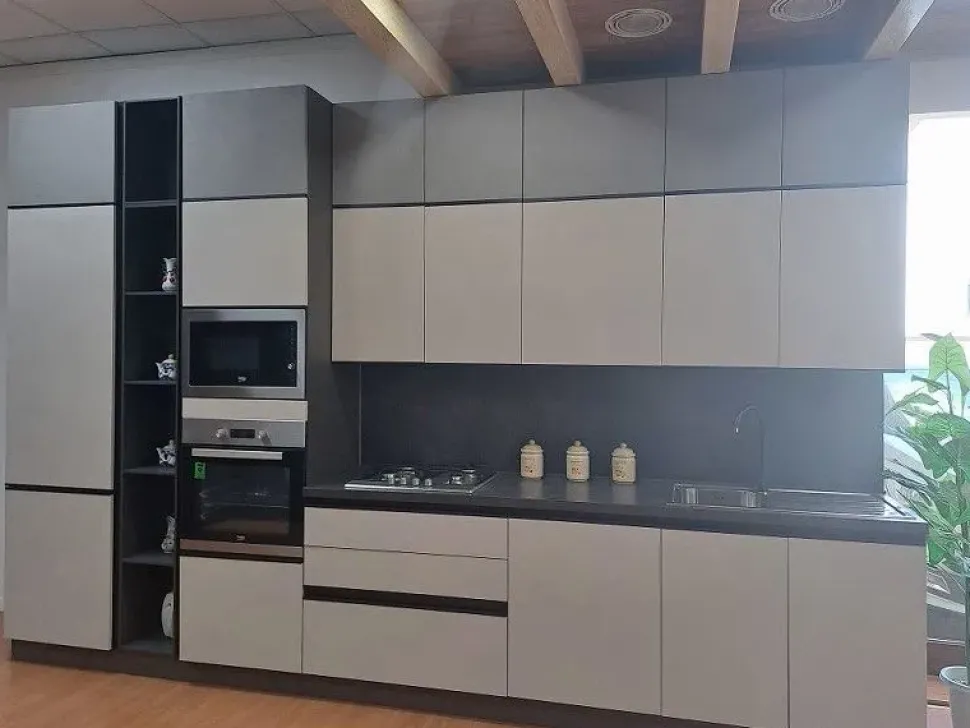 cucina lineare metri 3,63, altezza 264 cm. Doppi pensili per aumentare la capienza. Apertura senza maniglia con profilo verticale e orizzontale in metallo nero o inox. Anta in finitura cemento col. ghiaccio per colonne e fila bassa pensili, ardesia per seconda fila alta di pensili. Struttura col. antracite. Anta in mdf con profilo metallico col. nero sul bordo superiore. Top laminato spessore 4 cm col vulcanic, alzatina in tinta. Zoccolo PVC nero. Elettrodomestici marca Candy inclusi. La colonna a giorno tra le 2 colonne non è compresa. Disponibile in 9 finiture per ante, 5 colori per struttura e 20 colori per top. Possibilità di sostituire il piano cottura a gas con uno ad induzione senza maggiorazione. MISCELATORE E PORTA POSATE OMAGGIO Il trasporto è compreso nel raggio di 100 km complessivi dalla nostra sede. Non esitate a contattarci per qualsiasi informazione!