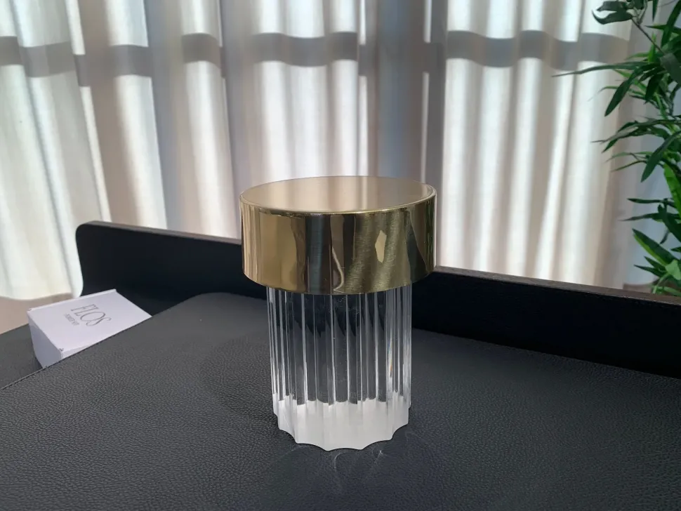 Lampada ricaricabile che diffonde la luce attraverso una base di vetro solido trasparente la cui forma fa riferimento alla tipologia architettonica dell’antica colonna.