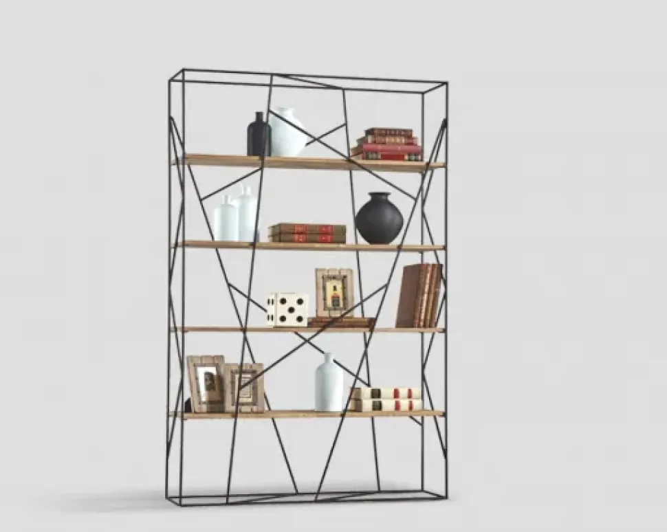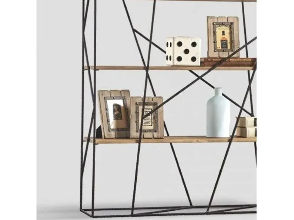Libreria bifacciale, struttura in metallo zigrinato finitura Ferro Brunito, piani finitura Naturale