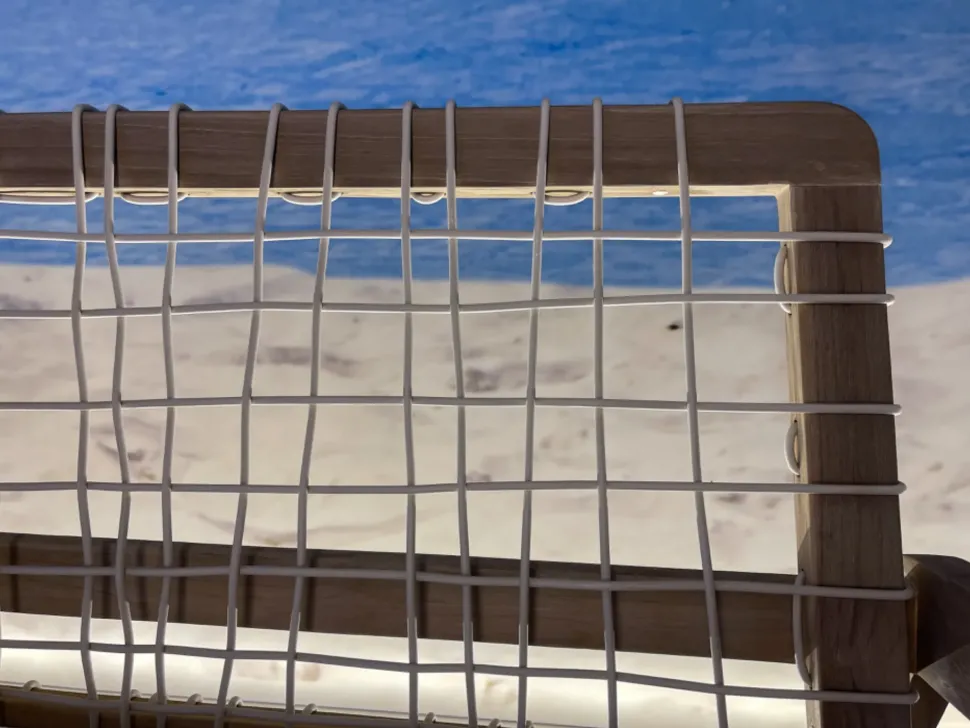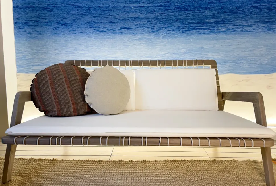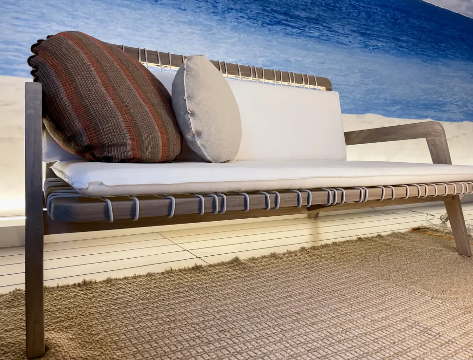 Grazie alla sua resistenza agli agenti atmosferici, il divano INOUT 863 è ideale per terrazzi, piscine e giardini, unendo la bellezza del legno naturale a un design moderno e ricercato.