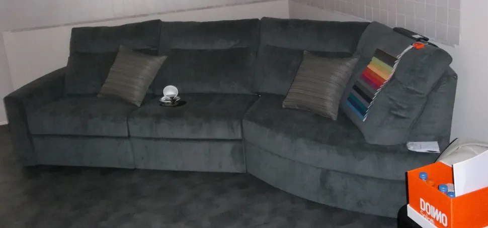 DIVANO OPIUM DI DOIMO SALOTTI CON RIVESTIMENTO ANTIMACCHIA DILETTA COLORE 77 E DUE CUSCINI CM 300X136. IL DIVANO PRESENTA UNA LEGGERA CURVATURA.