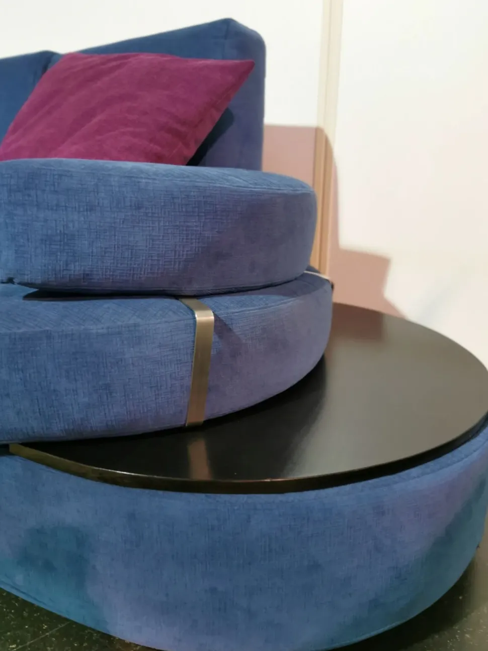 Divano angolare con sagoma arrotondata. Completo di pouf e ripiano poggia vivande interamente sfoderabile. Tre cuscini in dotazione al divano. Tessuto blu e viola. Dimensioni 230×260 cm.