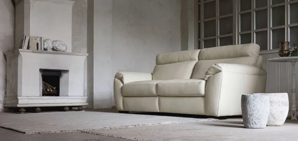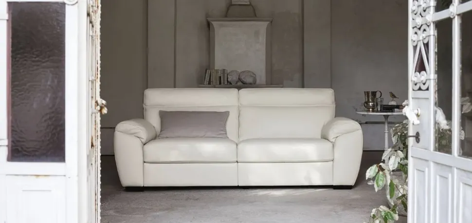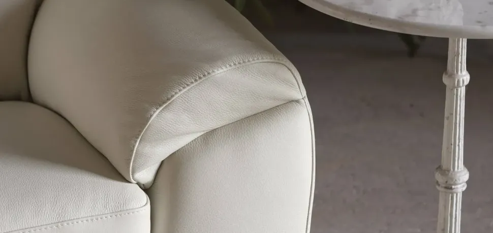 La struttura è realizzata in legno massello di abete, imbottita con poliuretano espanso ad alta resilienza e rivestita in vera pelle, per garantire durata, sostegno e un estetica di pregio. Il modello presentato è rivestito in pelle bianco panna Selene 214, una tonalità calda e versatile che illumina ogni ambiente con un tocco di sofisticata delicatezza.
