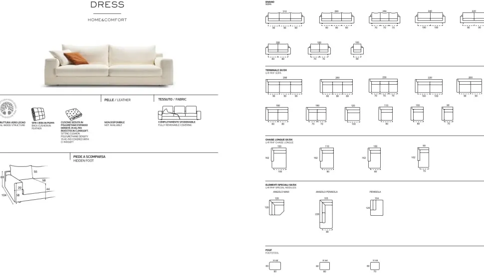 Arredo Design srls vi propone di Rosini i divani modello Dress in offerta outlet, con cuscini degli schienali in piuma.