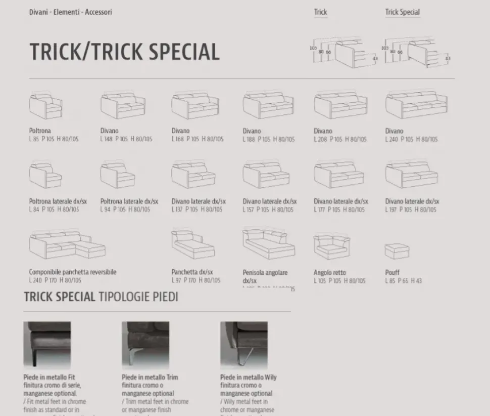 - Dopo aver selezionato attentamente lo stile, i materiali e le misure degli imbottiti, è essenziale valutare pure la tipologia di seduta che fa al caso tuo: questo modello Trick special è con poggiatesta, ideale per ottenere il meglio dallo spazio disponibile garantendoti ogni giorno la piena comodità nei momenti di relax e confermando, contemporaneamente, le doti estetiche del tuo soggiorno.