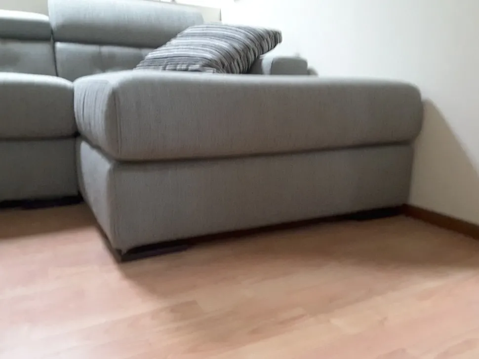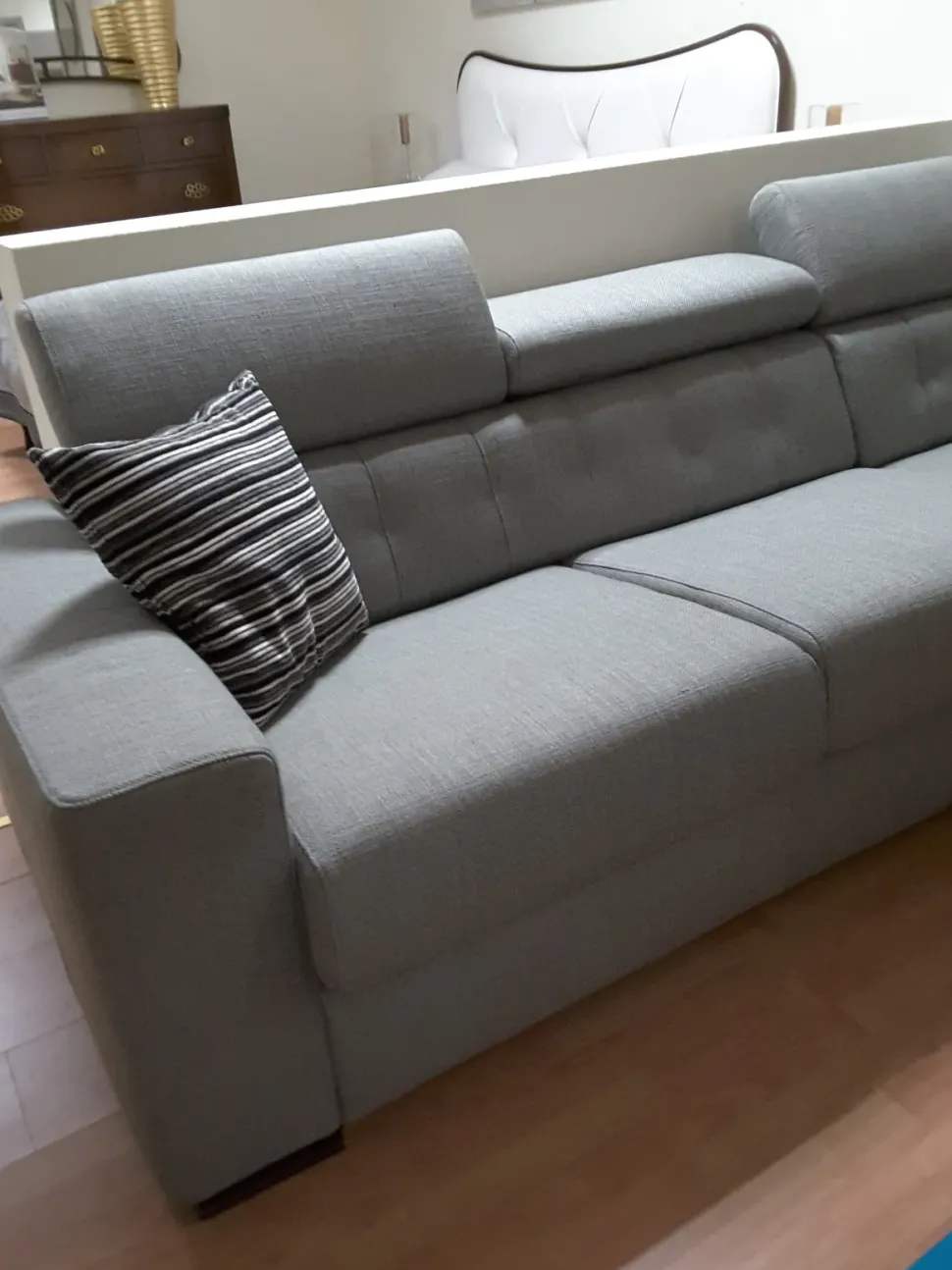 Divano composto da elemento lineare con bracciolo ed elemento chaise longue rispettivamente da cm 163 e cm 102 per una lunghezza totale di cm 265 x 160 lato chaise longue. La profondità dell’elemento divano è di cm 100 e l’altezza della seduta cm 45 da terra. Lo schienale ha un comodo e imbottito cuscino poggia reni e un pratico poggiatesta alzabile a scatto. L’altezza totale dello schienale è di cm 76 con poggiatesta basso e cm 90 alto. Il salotto è rivestito in tessuto ed è sfoderabile per una pratica pulizia. Prodotto in esposizione disponibile e in buone condizioni. Ultimo pezzo disponibile proposto in promozione. Nel prezzo non è compresa la consegna, preferito ritiro diretto presso nostra sede.