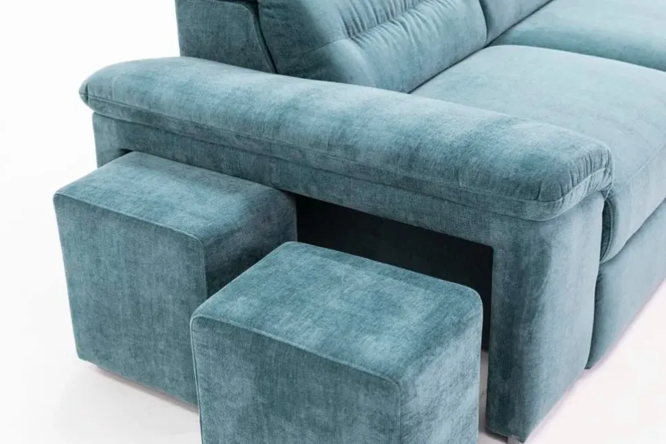 - Tipologia divani con penisola: questa proposta è totalmente imbottita in poliuretano, ideale per assicurare morbidezza e resistenza dopo anni di uso prolungato.